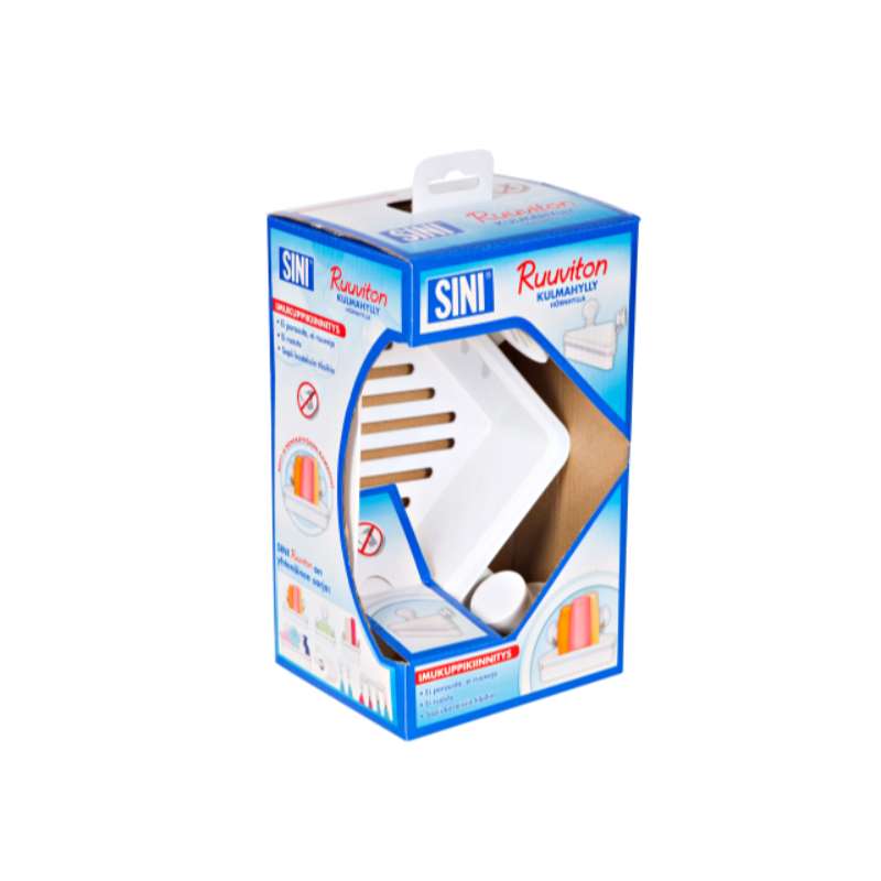 Kevyt ja monikäyttöinen SINI Ruuviton kulmahylly soveltuu kylpyhuoneeseen, keittiöön ja kodinhoitotilaan. Teline kiinnitetään imukupeilla sileälle kaakeli- tai lasipinnalle ilman porausta ja ruuveja. Kiinnitys perustuu ainutlaatuiseen patentoituun imukuppiin, jota ympäröi ilma- ja vesitiivis silikonirengas. Kulmahylly on nurkkamallin ratkaisu, jolloin pesuaineet löytyvät aina oikeasta paikasta. Rakenna erilaisista Ruuviton-sarjan tuotteista itsellesi sopivin kokonaisuus yhdistelemällä eri osia haluamallasi tavalla!