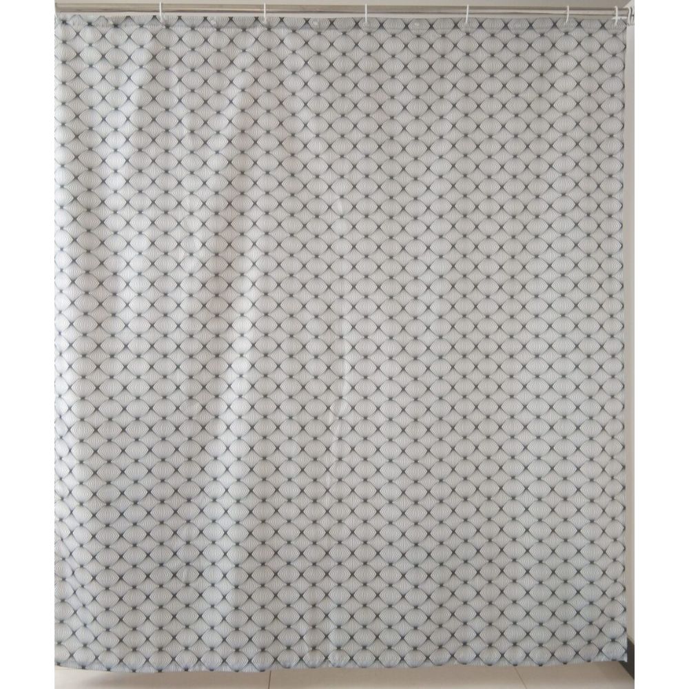 Kaunis suihkuverho geometrisella kuviolla, joka luo mukavan tunnelman kylpyhuoneeseen.