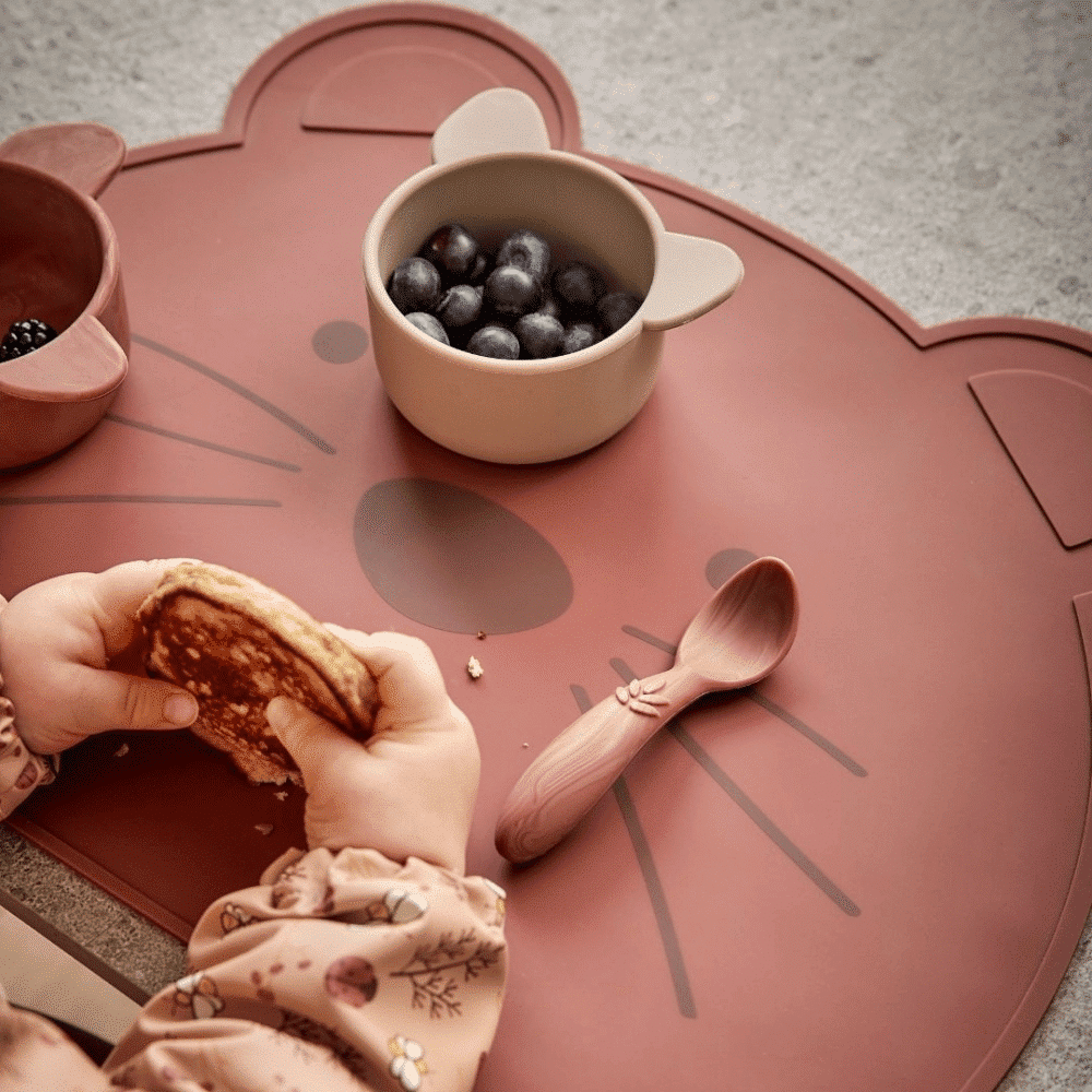 Hauska ja käytännöllinen ruoka-alusta silikoni mahogany Ester Nuuroo pysyy hyvin paikallaan ja suojaa pöytää sotkuilta. LFGB-sertifioidusta silikonista valmistettu ruokailualusta on helppo pitää puhtaana pyyhkimällä tai pesemällä astianpesukoneessa. Alusta ei sisällä vahingollisia kemikaaleja.