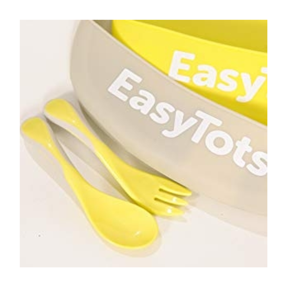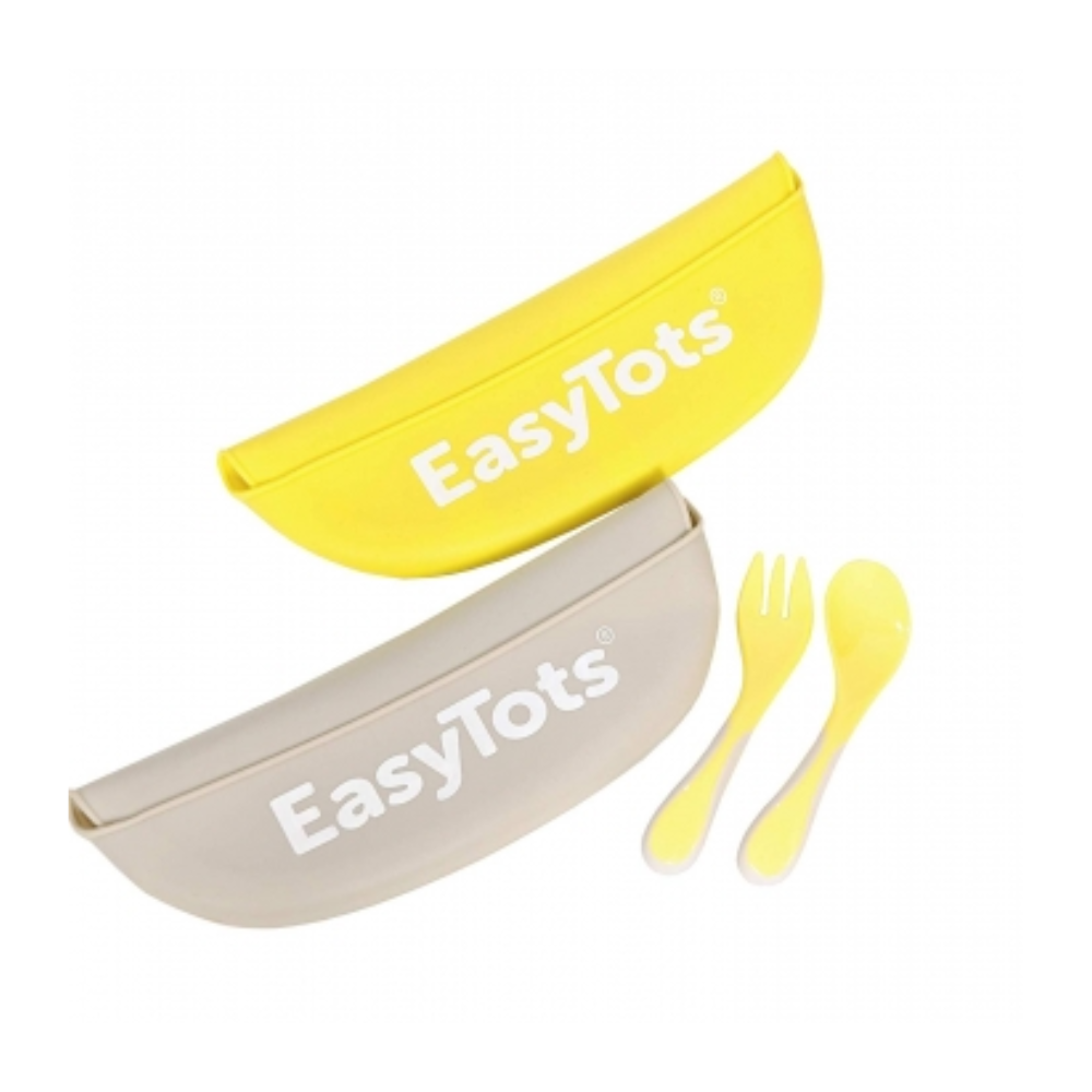 Pakkauksessa 2 superpehmeää silikoniruokalappua, värit harmaa ja keltainen. Ruokalaput on valmistettu LFGB EU-standardoidusta BPA-vapaasta silikonista, ja ne mahtuvat rullattuna pieneen tilaan. Pakkauksen mukana ergonomisesti muotoillut lusikka ja haarukka. Ruokailuvälineiden muotoilu helpottaa ruokailun opettelua.