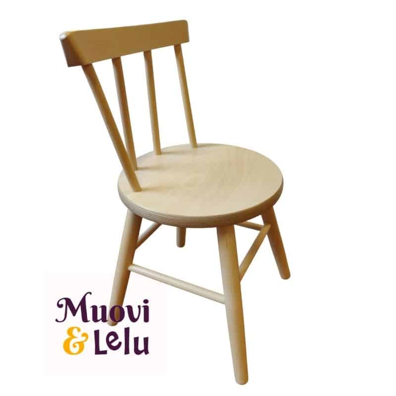 - Koivun värinen puutuoli. Lasten tuolissa on selkänoja.