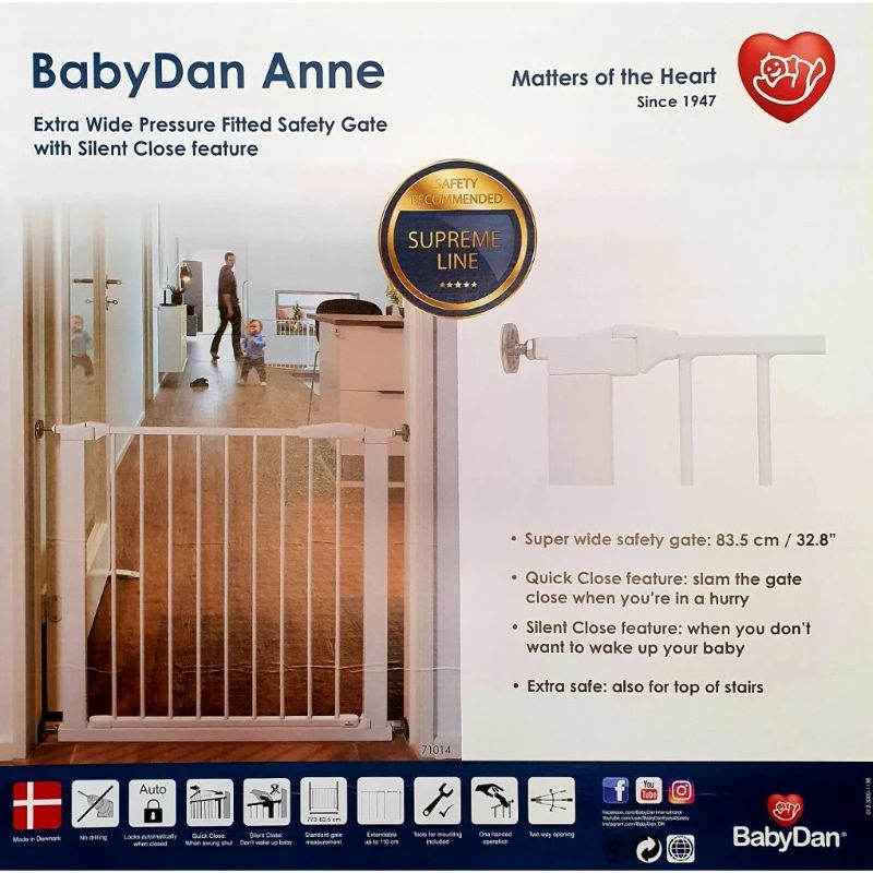 - Baby Dan Anne erottuu muista turvaporteista sen ainutlaatuisen kahvan ansiosta, joka antaa portin sulkeutua automaatisesti. Ovi sulkeutuu hiljaa perässäsi eikä lapsi herää portin kolinaan. Kahvassa oleva osoitin näyttää kun portti on kunnolla kiinni. Aikuinen saa avattua portin helposti yhdellä kädellä ja portti avautuu molempiin suuntiin. Puristinkiinnitys seinäkiinnikkeillä ja kiinnitysteipillä – EI poraamista! Tarvittavat työkalut sisältyvät pakkaukseen.