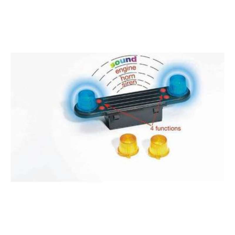 Nyt saat Bruder ajoneuvoon ääni ja valotoiminnot tämän lisäosan avulla. Lisää jännitystä leikkihetkiin! Ääni- ja valomoduli tuottaa neljä toimintoa: äänitorvi, moottorin ääni, vilkkuvalo sekä sireeni. Sireenin äänen saa vaihdettua eurooppalaisen ja amerikkalaisen välillä kytkimellä.