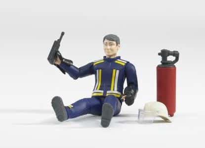 Palomieshahmo sopii hyvin Bruder paloauton kyytiin sammutustehtäviin! Palomiehellä on kypärä, hanskat, radiopuhelin ja käsisammutin varusteina. Jos palomies ei yksin selviä urakasta, hän kutsuu apua radiolla.