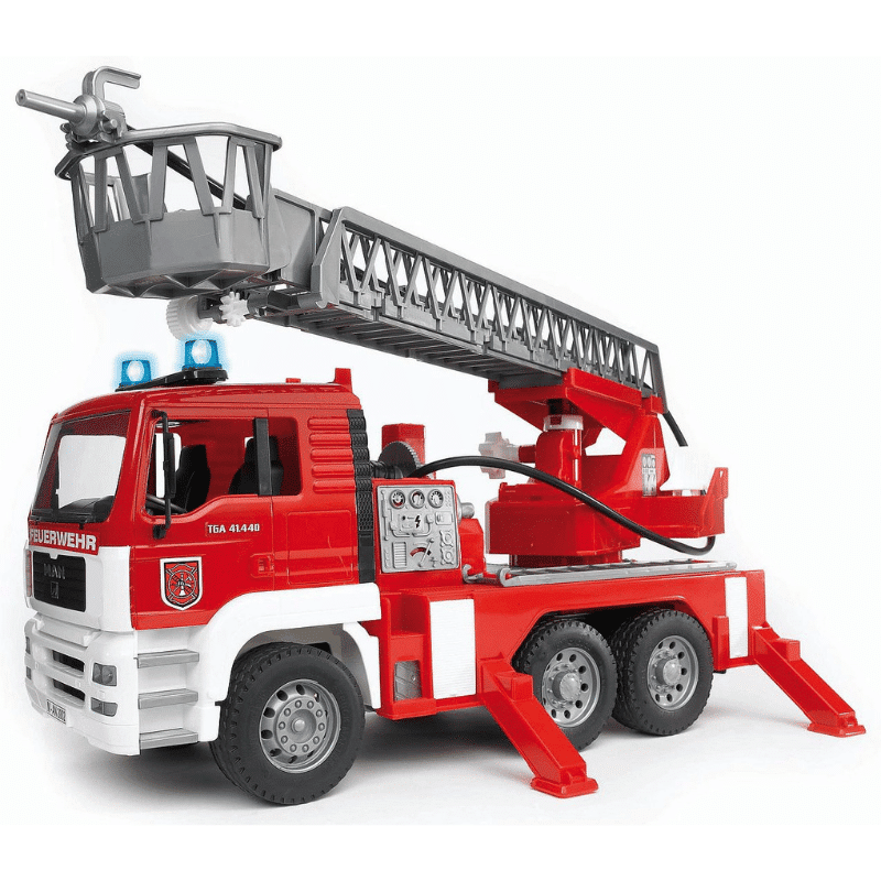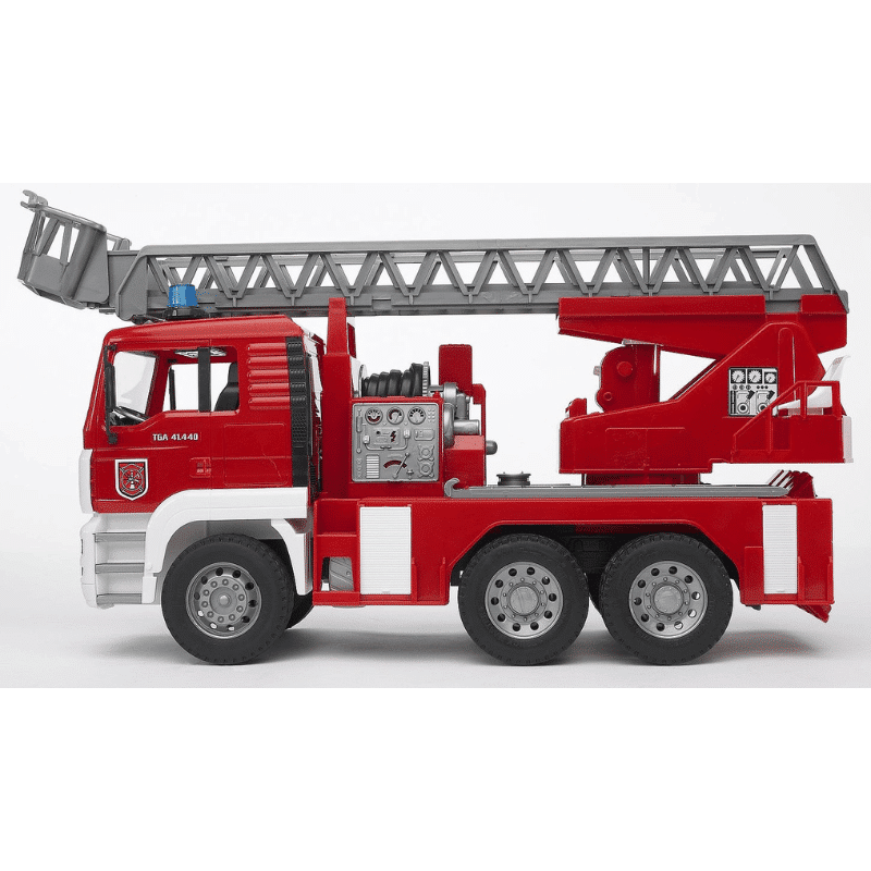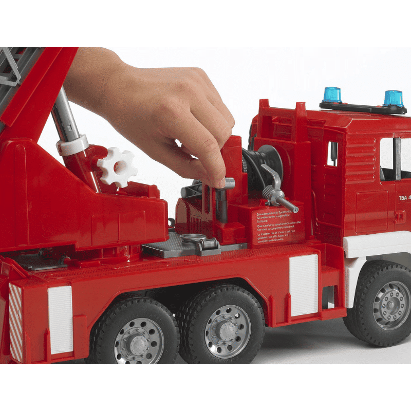 Bruder paloautossa on tikkaat, vesipumppu, valot ja ääni. Pelastuskorilla varustetut tikkaat voi nostaa. Lisäksi paloautossa on tukijalustat paloauton tasapainottamiseksi. Leikkipaloautossa oleva vesipumppu mahdollistaa veden ruiskuttamisen.