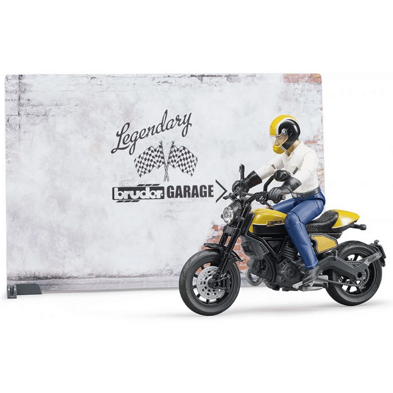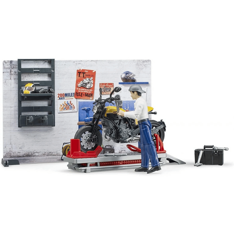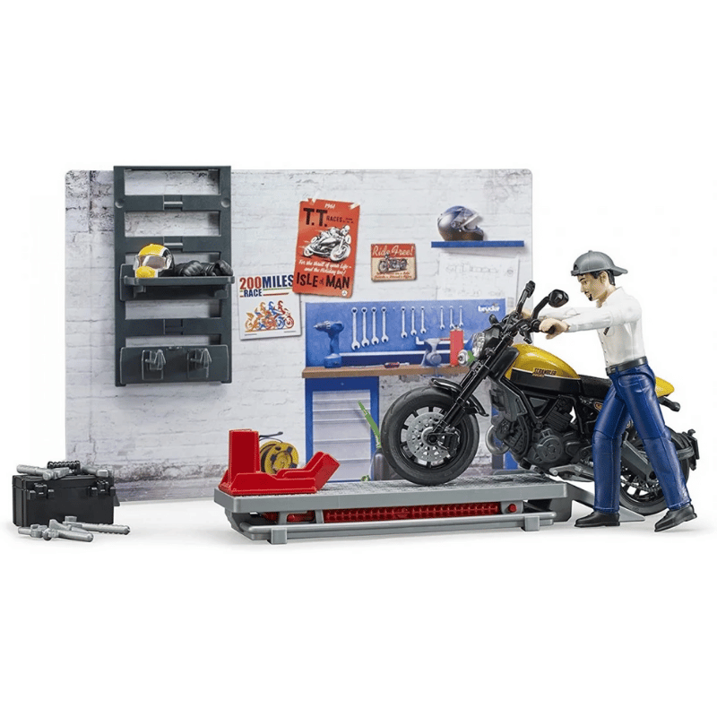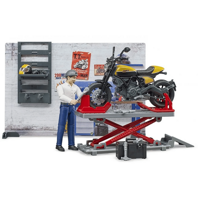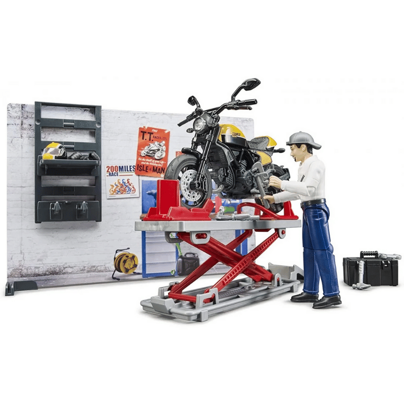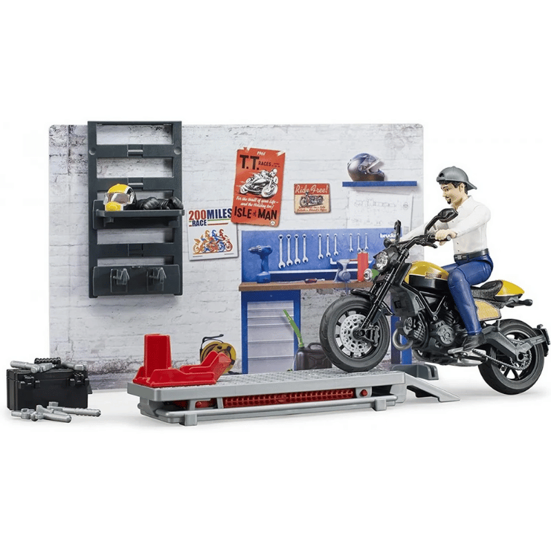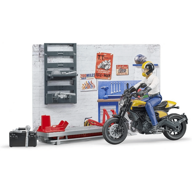 Bruder bworld moottoripyöräkorjaamolla osataan korjata mikä tahansa vika. Aseta moottoripyörä telineeseen ja nosta se ylös, näin vian korjaaminen on helppoa. Työkalupakista löytyy kaikki tarpeellinen. Mukana on myös taustaseinä. Scrambler Ducati Full Throttle on kaikkien vauhtia rakastavien leikkijöiden unelma! Tämä täyteen yksityiskohtia varustettu menopeli on pienikokoinen mutta mahtava leikkikaveri, joka ylittää vaikeat esteet niin pihalla kuin olohuoneessakin.
