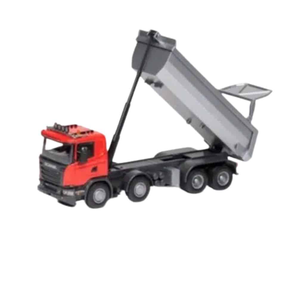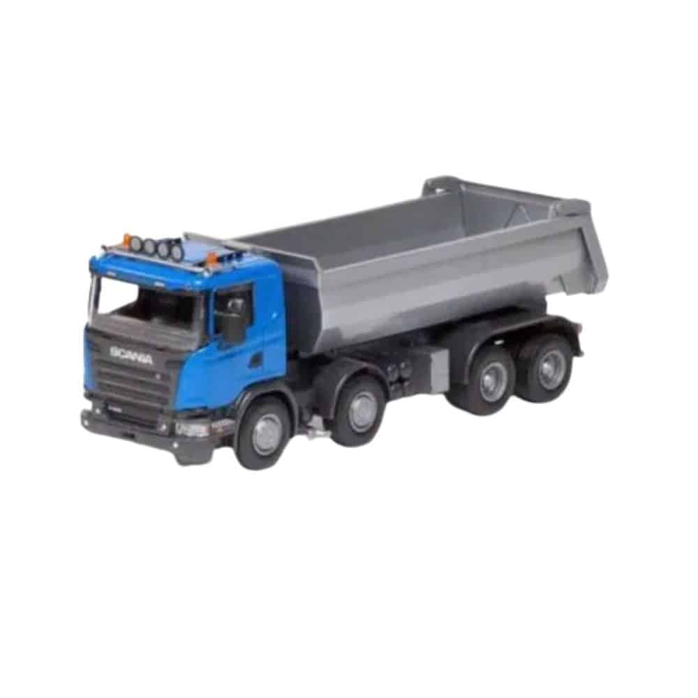 4-akselinen Scania maansiirtoauto, jossa on takapyöräjousitus, kippi, avattava takalaita ja peilit. Tuotteen pituus on 36 cm. Lajitelmassa on kaksi erilaista: sininen ja punainen. Tuote on ikkunapakkausessa.