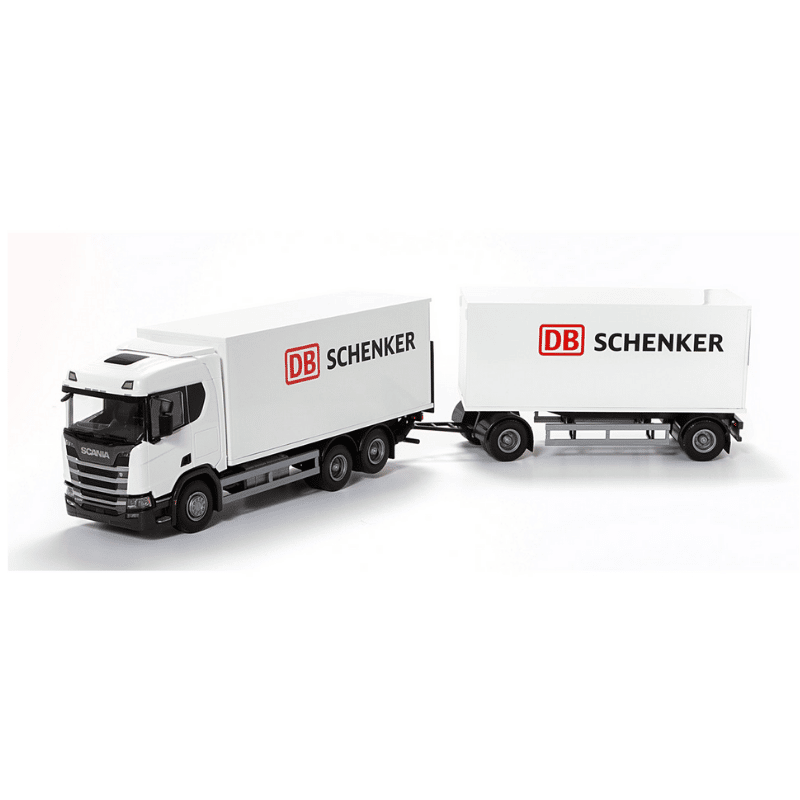 Jakelurekka, jonka vetoautossa on takapyöräjousitus ja takalaitanostin lastauksen helpottamista varten.