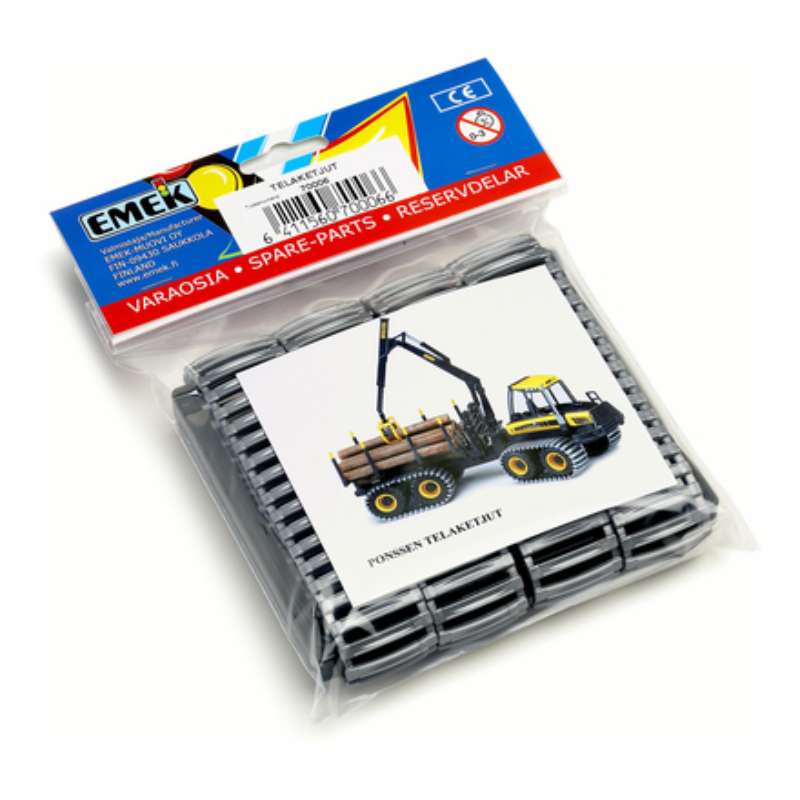 Telaketjut Ponssen metsäkoneeseen. Telaketjut sopivat vain Emekin valmistamiin tuotteisiin. Ei sovellu alle 3-vuotiaille, tukehtumisvaara.