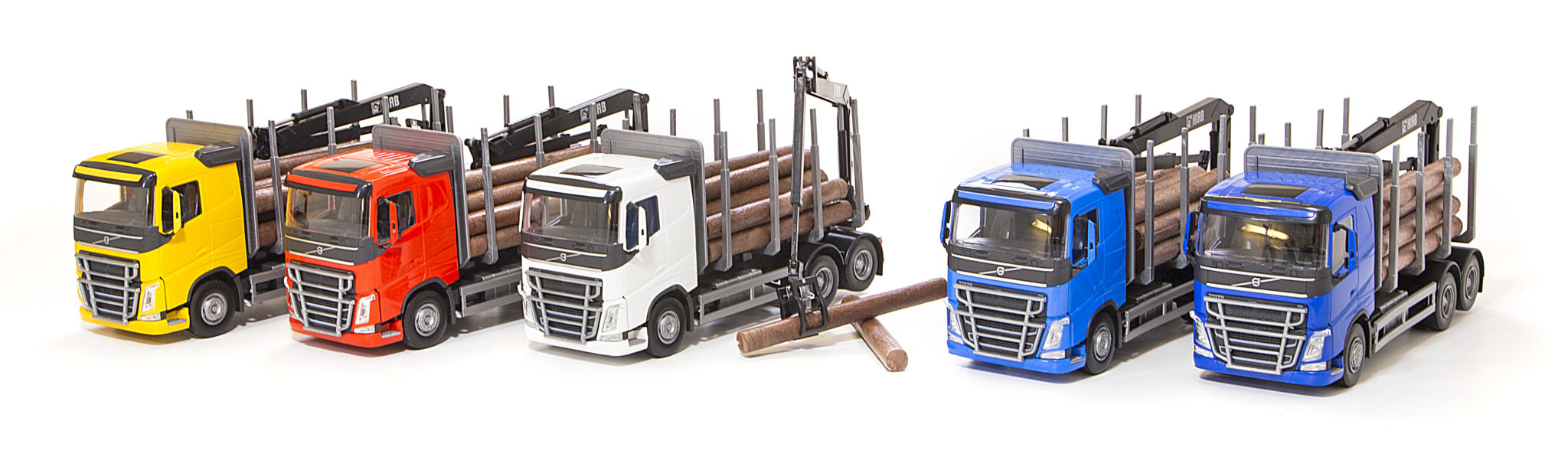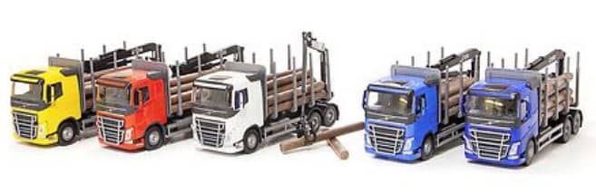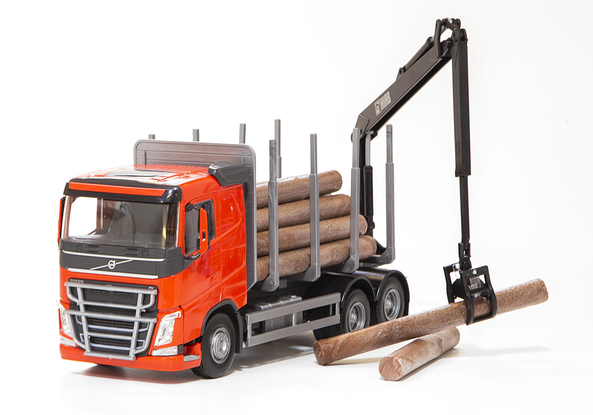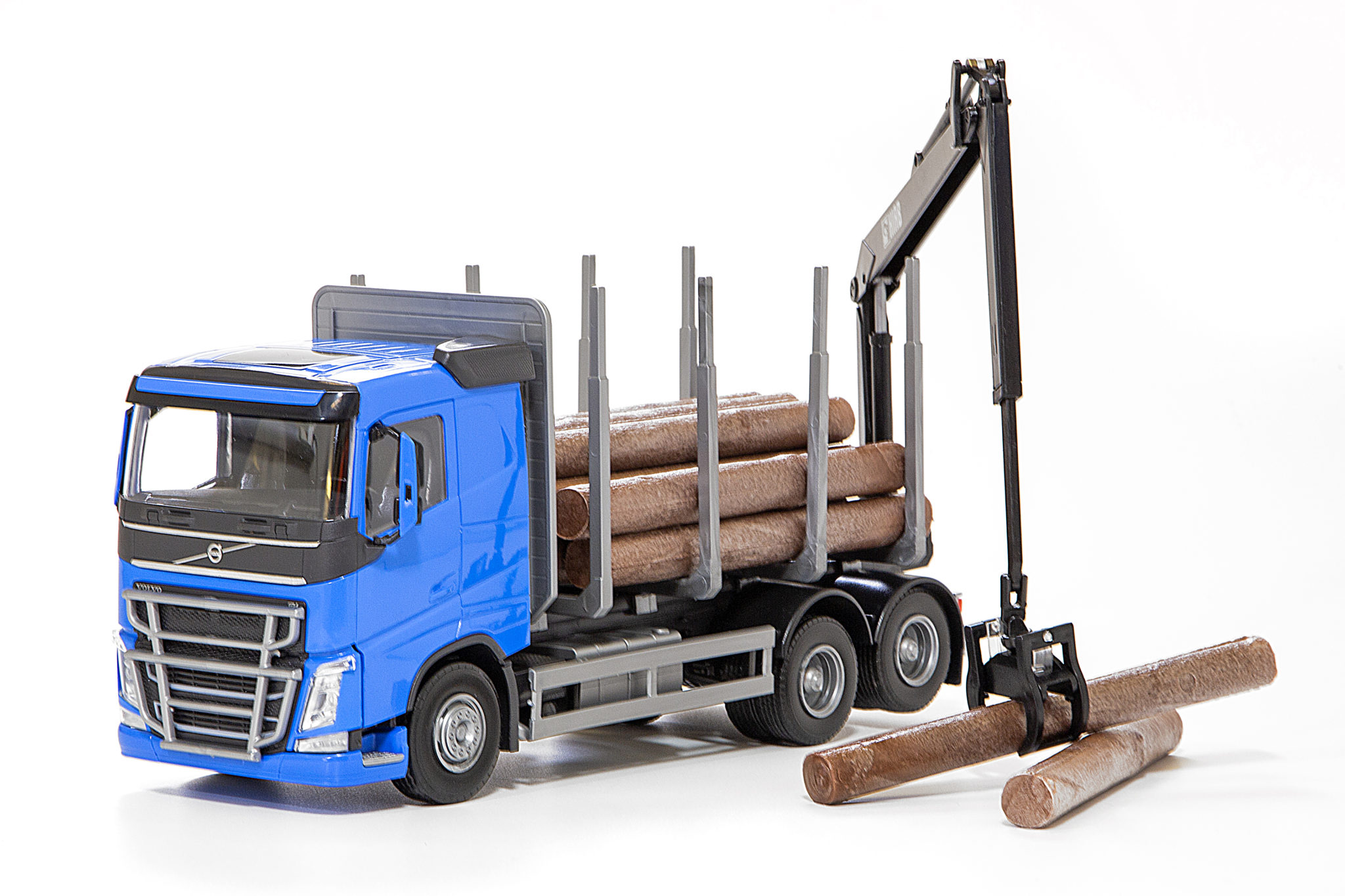 Volvo FH tukkiauto, jossa tukkinosturi tukkien lastaamiseen. Värilajitelma. Tuotteen koko 33 cm.