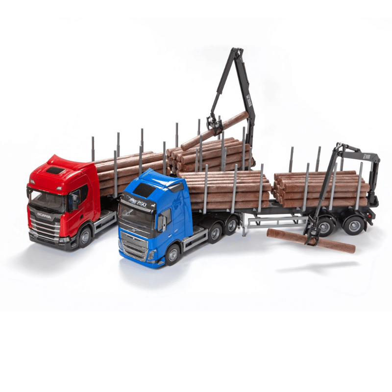 Hieno tukkipuoliperärekka, jossa on tukkien lisäksi liikuteltavat pankot, tukkinosturi ja peilit. Vetoautossa vetopöytä on mahdollista lukita ja kärryssä on seisontatuet. Vetoauto voidaan yhdistää muihin koppi- ja lavettirekkoihin. Tuotteen koko n. 57 cm.