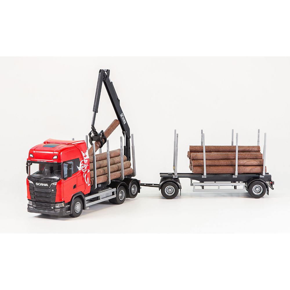 Scania CS tukkirekka hopeanvärisellä kotkankuvalla. Vetoautossa on takapyöräjousitus ja tuulispoileri sekä 2-akselinen peräkärry. Tukkien lisäksi liikuteltavat pankot, tukkinosturi sekä peilit.