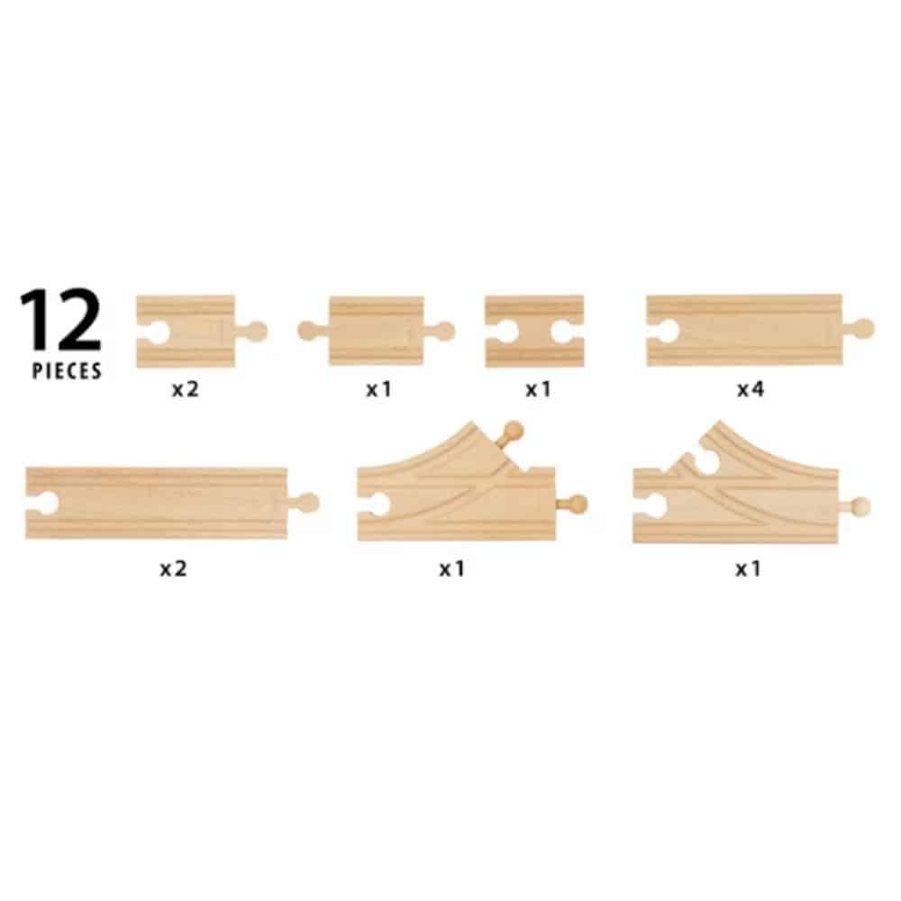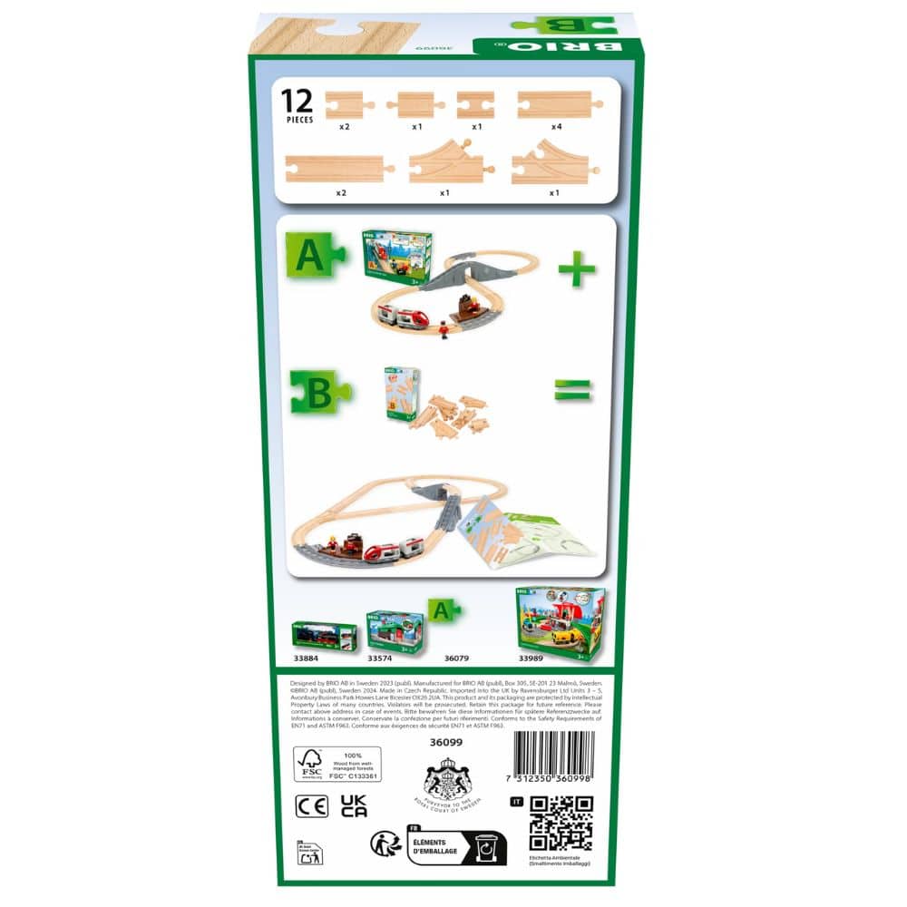 Laajenna BRIO World -junasettejä 36099 Kiskojen aloituspakkauksella. Voit yhdistää eripituisia suoria raitoja, vaihtoraitoja ja liitinraitoja, ja joko seurata ehdotettuja ratamalleja tai luoda omia avoimia malleja.