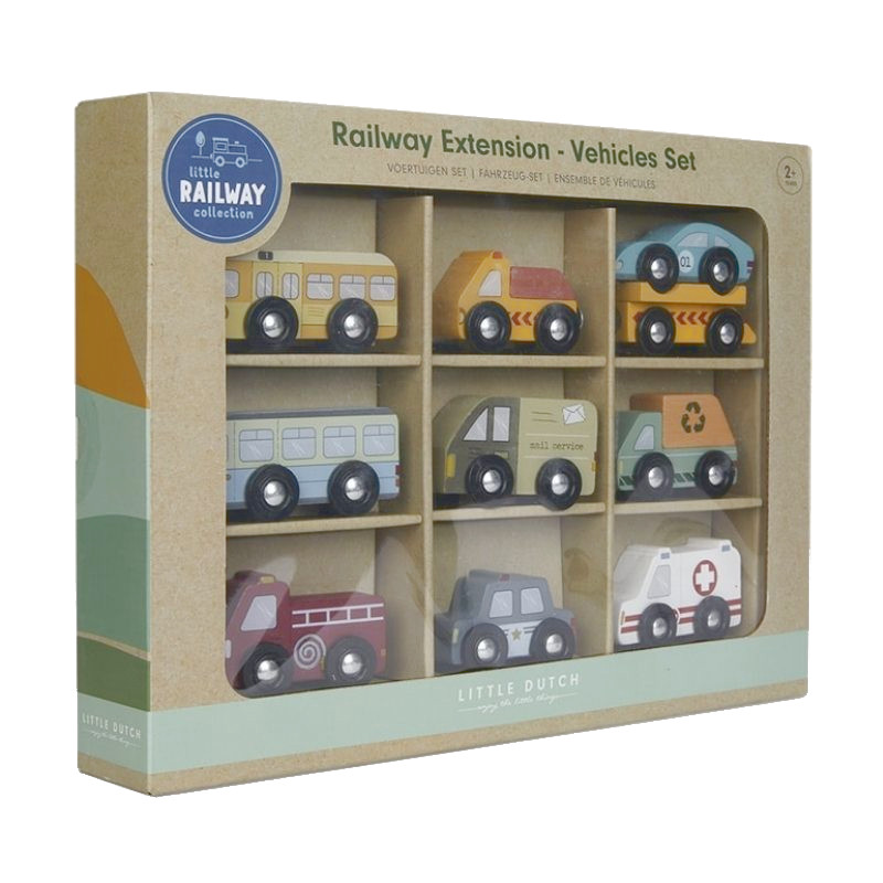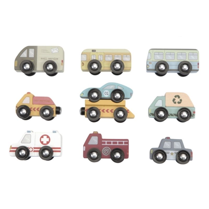 Tiamo Little Dutch puiset pikkuautot 9 kpl setti sisältää setin erilaisia ajoneuvoja, kuten ambulanssin, paloauton, poliisiauton ja postiauton. Ajoneuvojen renkaat on tarkoitettu ajettavaksi puisella junaradalla.