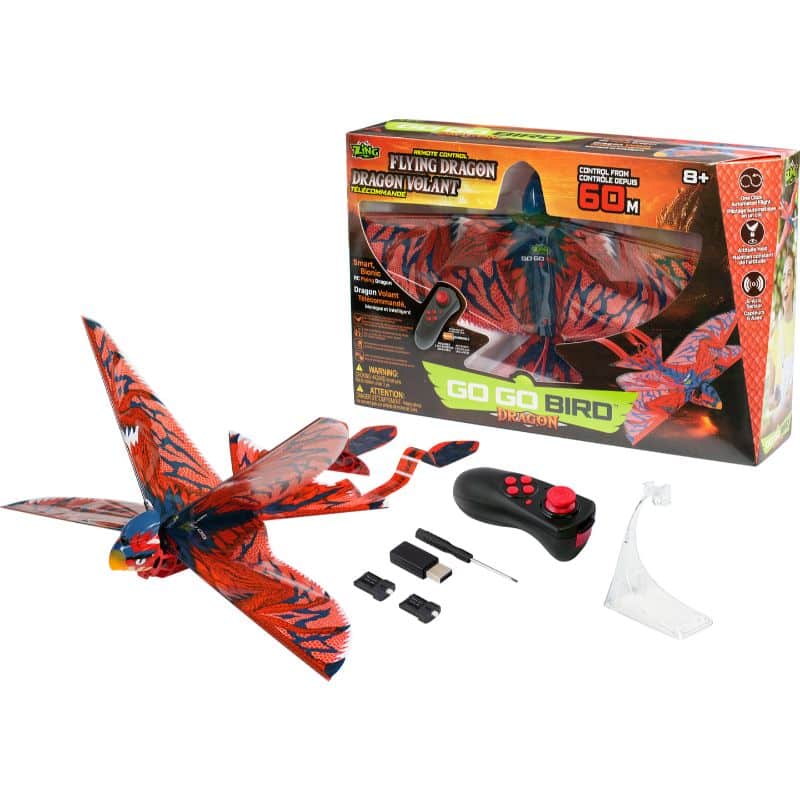 Go Go Bird punainen lentävä lohikäärme on älykäs, bioninen radio-ohjattava liihottavilla sivillään ja sitä on helppo ohjata yhdellä kädellä. Oikean linnun lailla se väistää automaattisesti esteitä sekä tekee temppuja.