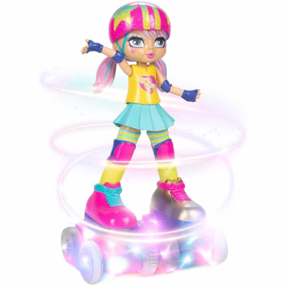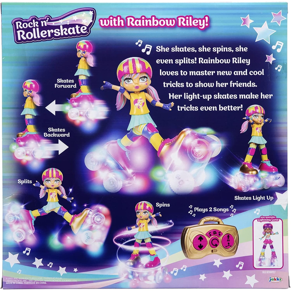 Lähde rullaluistelemaan Rileyn kanssa. Tee spakaatteja ja piruetteja musiikin tahtiin. Musiikkisoittimen mallisesta kaukosäätimestä voit vaihtaa musiikkia ja saat Riley-tytön tekemään uskomattomia rullaluistelutemppuja. Rileyn rullaluistimen värivalotehosteet tekevät ajosta hauskan ja jännittävän.