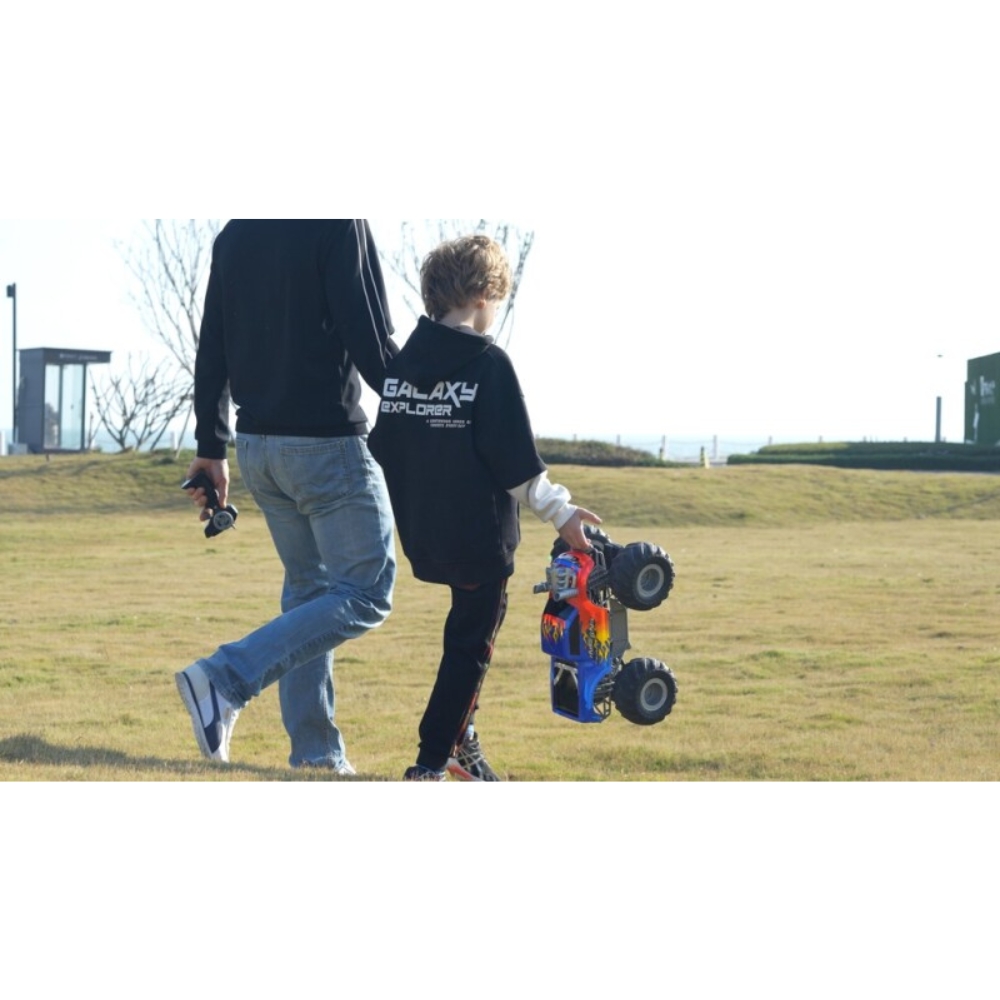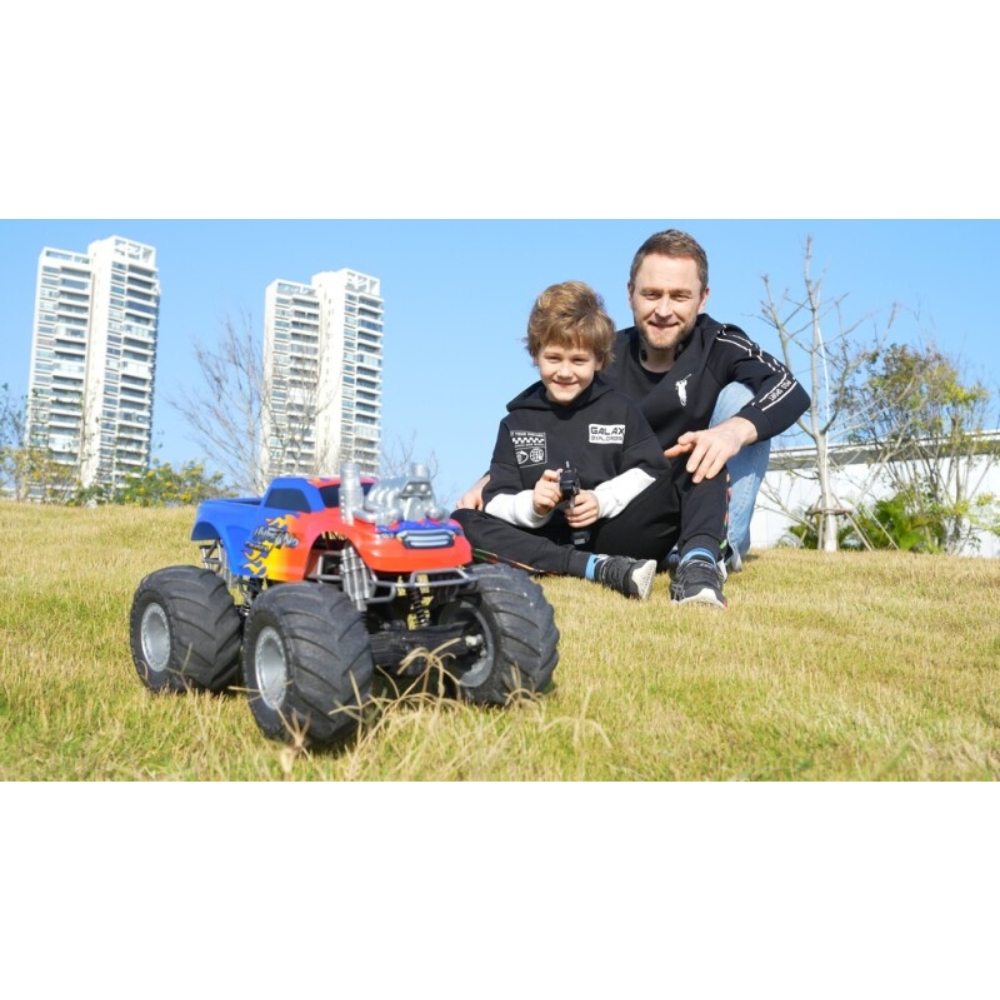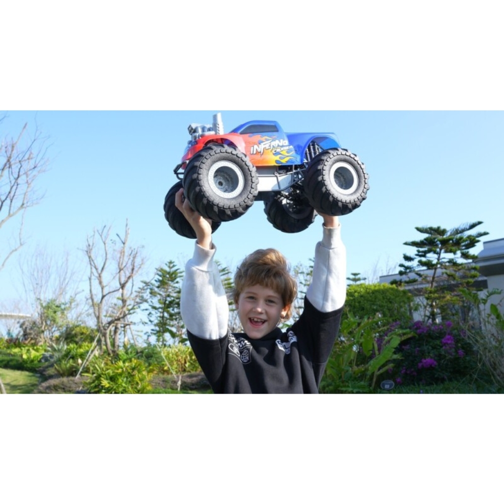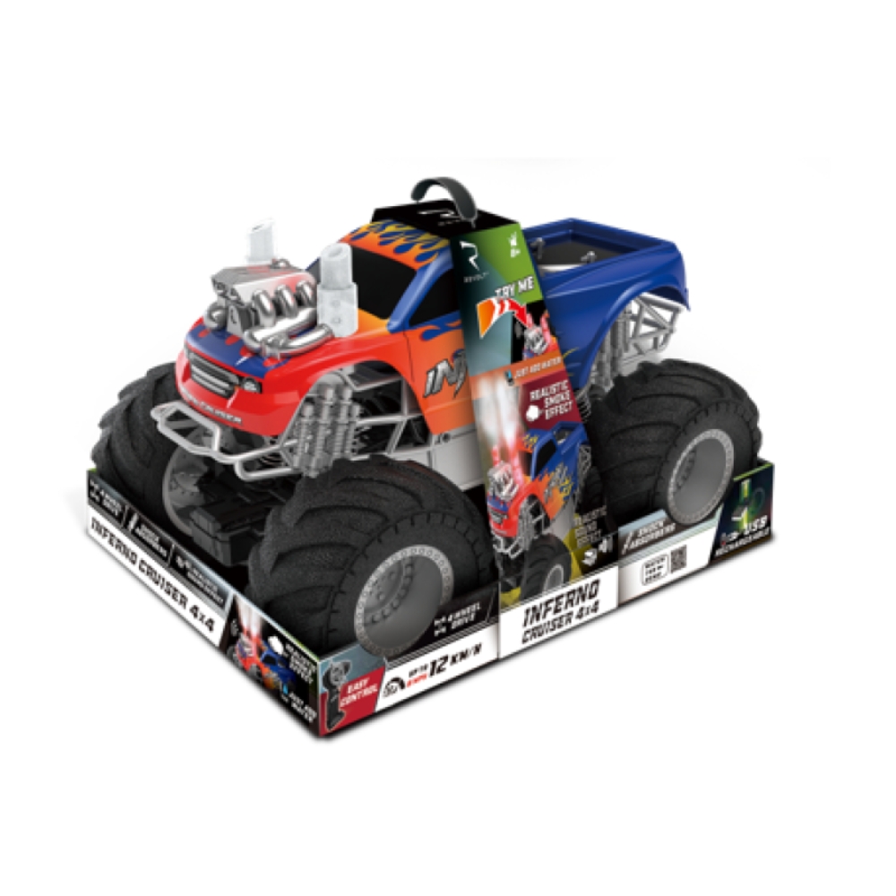 Valloita jokainen maasto INFERNO CRUISER akkukäyttöisellä radio-ohjattavalla monsteriautolla! Tämä suurikokoinen monsteriauto valloittaa kaikki maastot valtavilla renkaillaan. Koe ainutlaatuinen hauskuus, kun savu ja liekit nousevat pakoputkesta – täysin turvallisesti, tarvitset vain hanavettä!