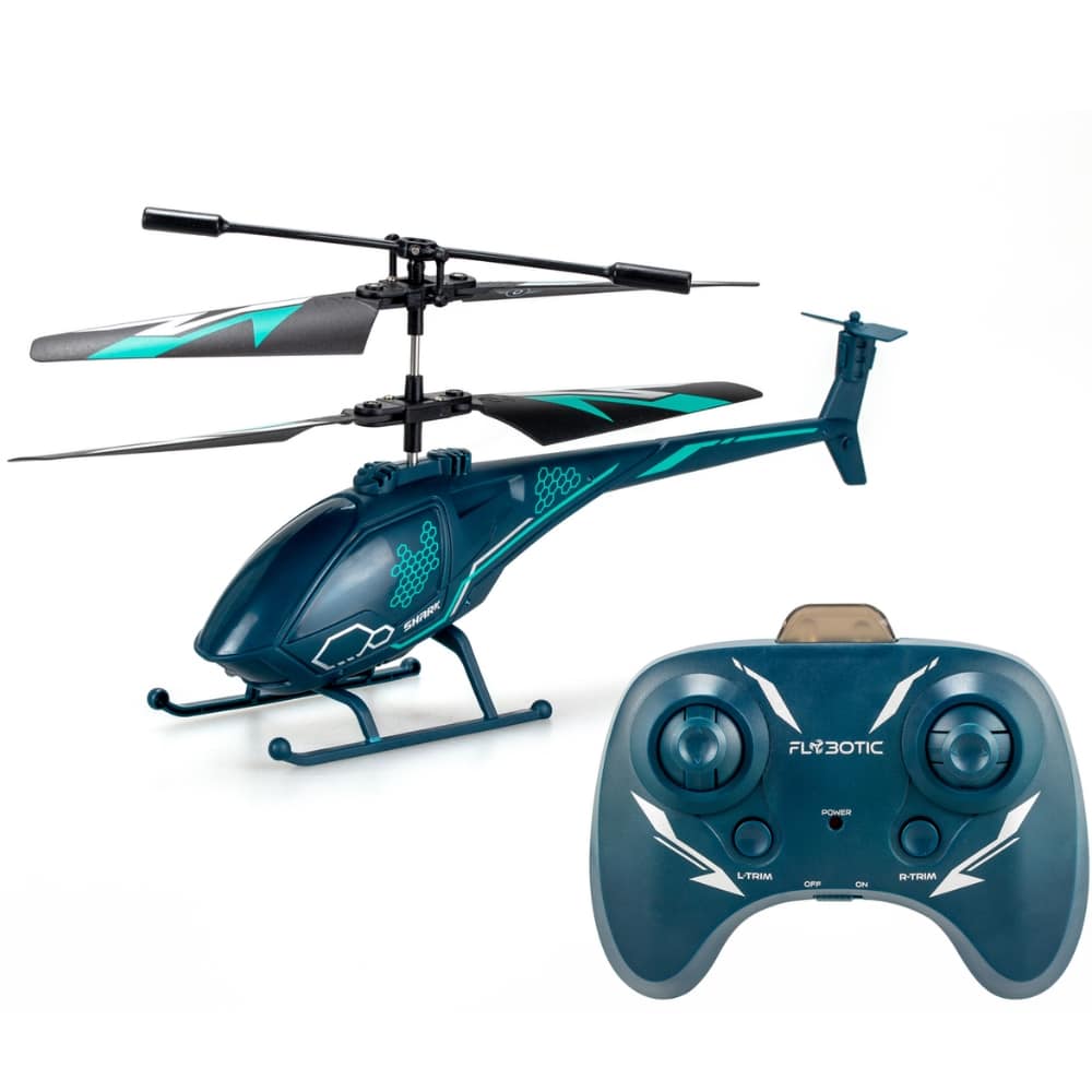 Pieni ja näppärä Flybotic Air Shark kauko-ohjattava helikopteri. 2-kanavainen ohjaus ylös, alas, vasen ja oikea. Led-valot edessä. Vaimennusvaikutus kaasun säätimessä mahdollistaa jatkuvan lennon ja lennon hitaasti ylös.