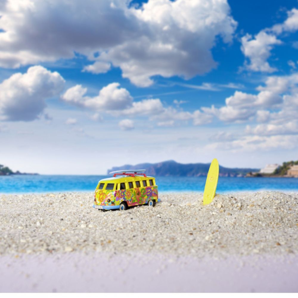 Tämä täysin käyttövalmis (100 % RTR) RC-auto on yksityiskohtaisesti maalattu legendaariseen Flower Power -tyyliin varustettu surfilaudalla katolla, LED-valoilla edessä ja takana sekä vilkkuominaisuudella.