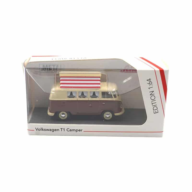 Volkswagen T1 Camper-keräilyajoneuvo nyt mini koossa! Metallisessa minibussissa on autenttiset yksityiskohdat, muovisia osia ja liikkuvat pyörät.