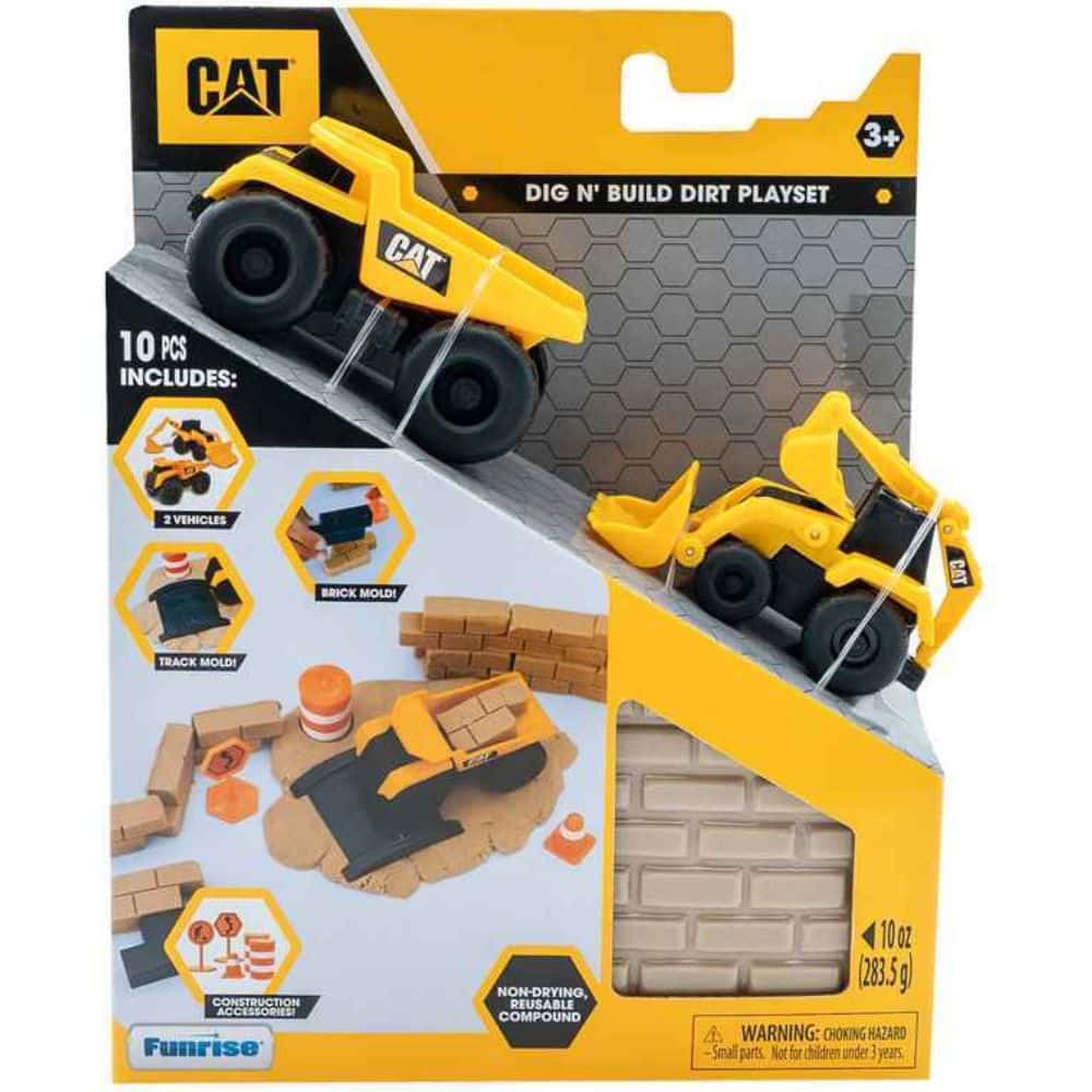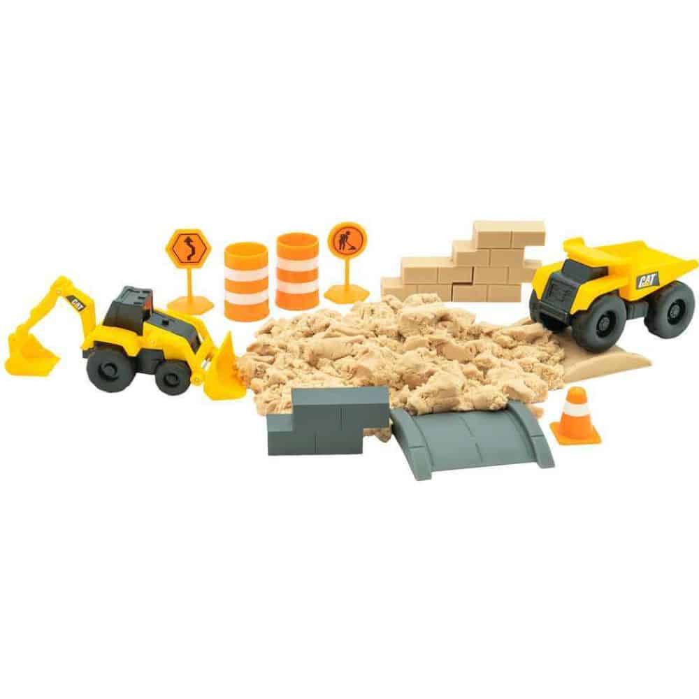 - Pakkaus sisältää miniatyyrikokoiset kaivurin ja kippiauton, leluhiekkaa ja muita työmaatarvikkeita.