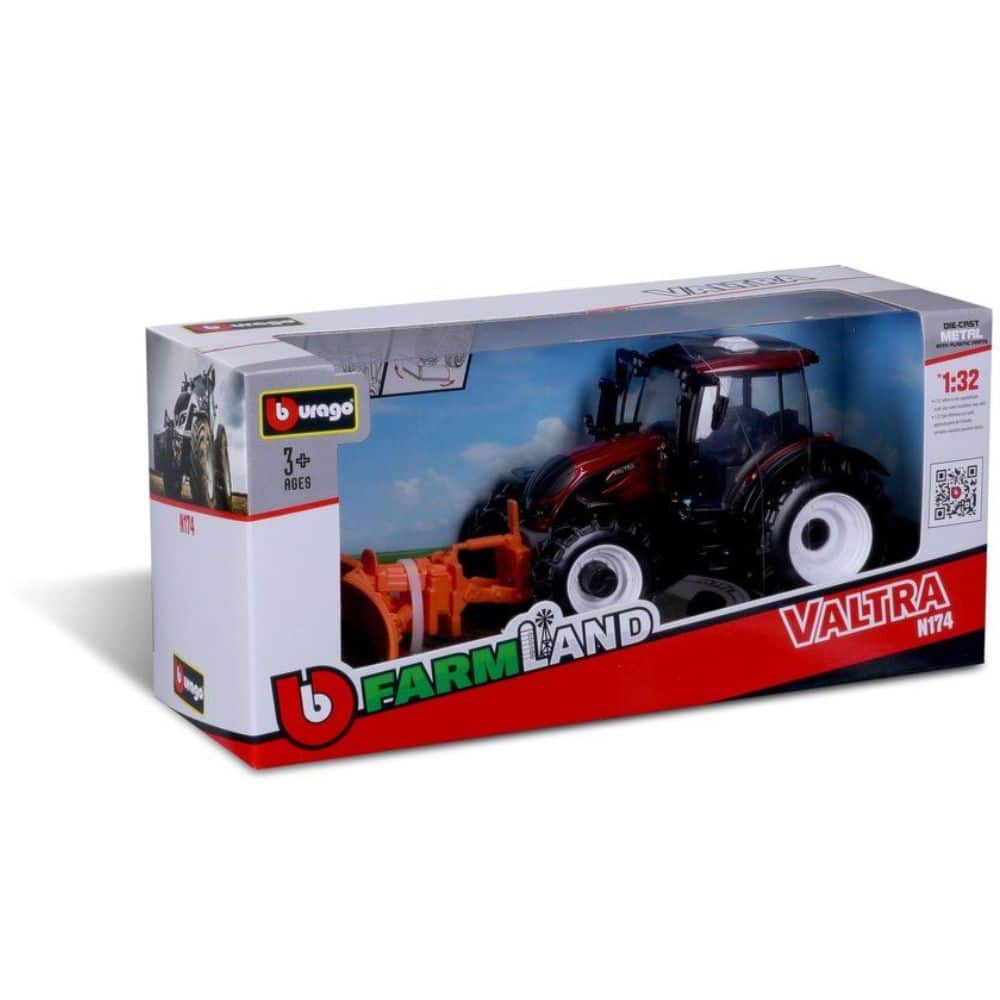 Burago-merkin Valtra Farm -traktori, jossa on lumiaura. Traktorissa on neljä paksua pyörää ja yksityiskohtainen ohjaamo sekä vetokoukku lisävarusteiden kiinnittämiseen. Täydellinen työkone leikintäyteisiin päiviin.