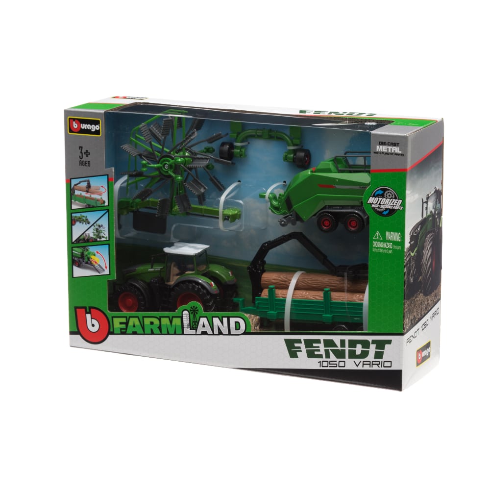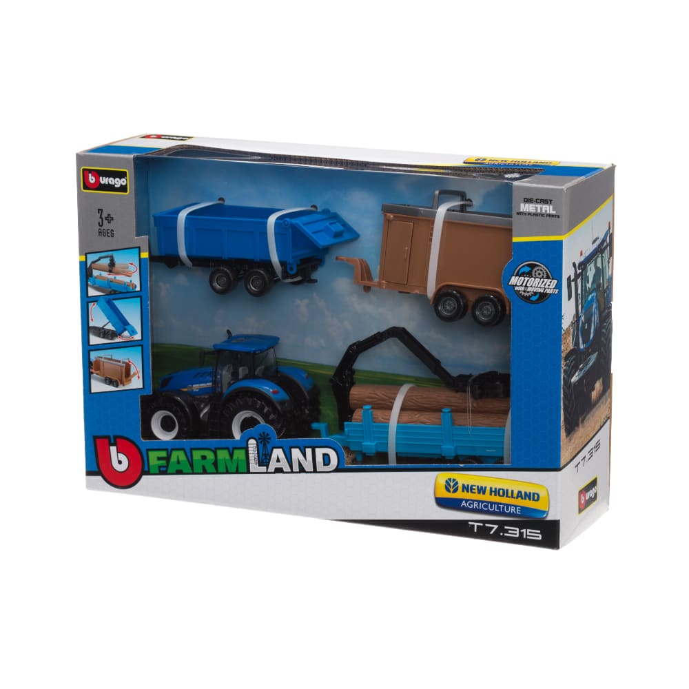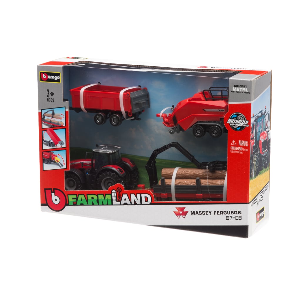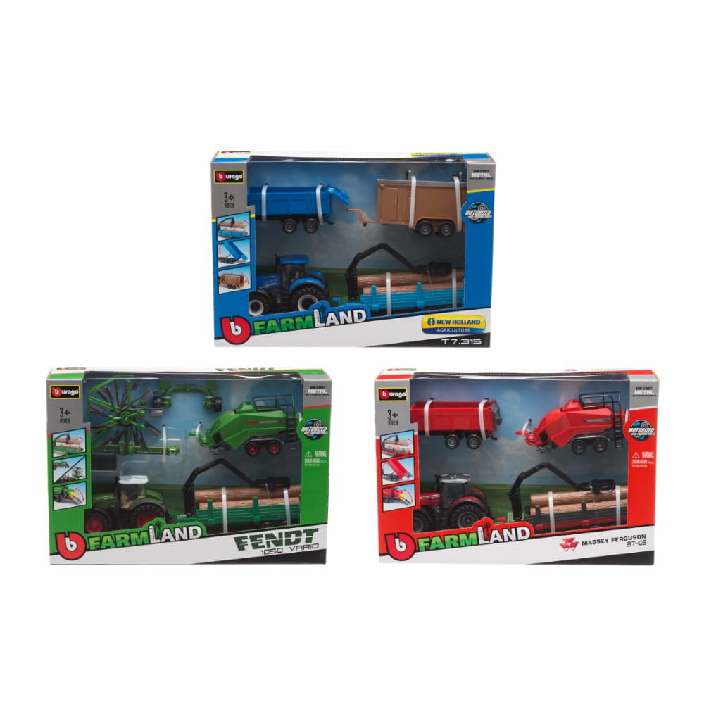 Upea leikkisetti, jossa on traktori ja kolme perävaunua. Traktorit ovat osittain metallisia. Osat ovat motorisoitu ja niissä on liikkuvia osia. Maanviljelytyöt voivat alkaa!