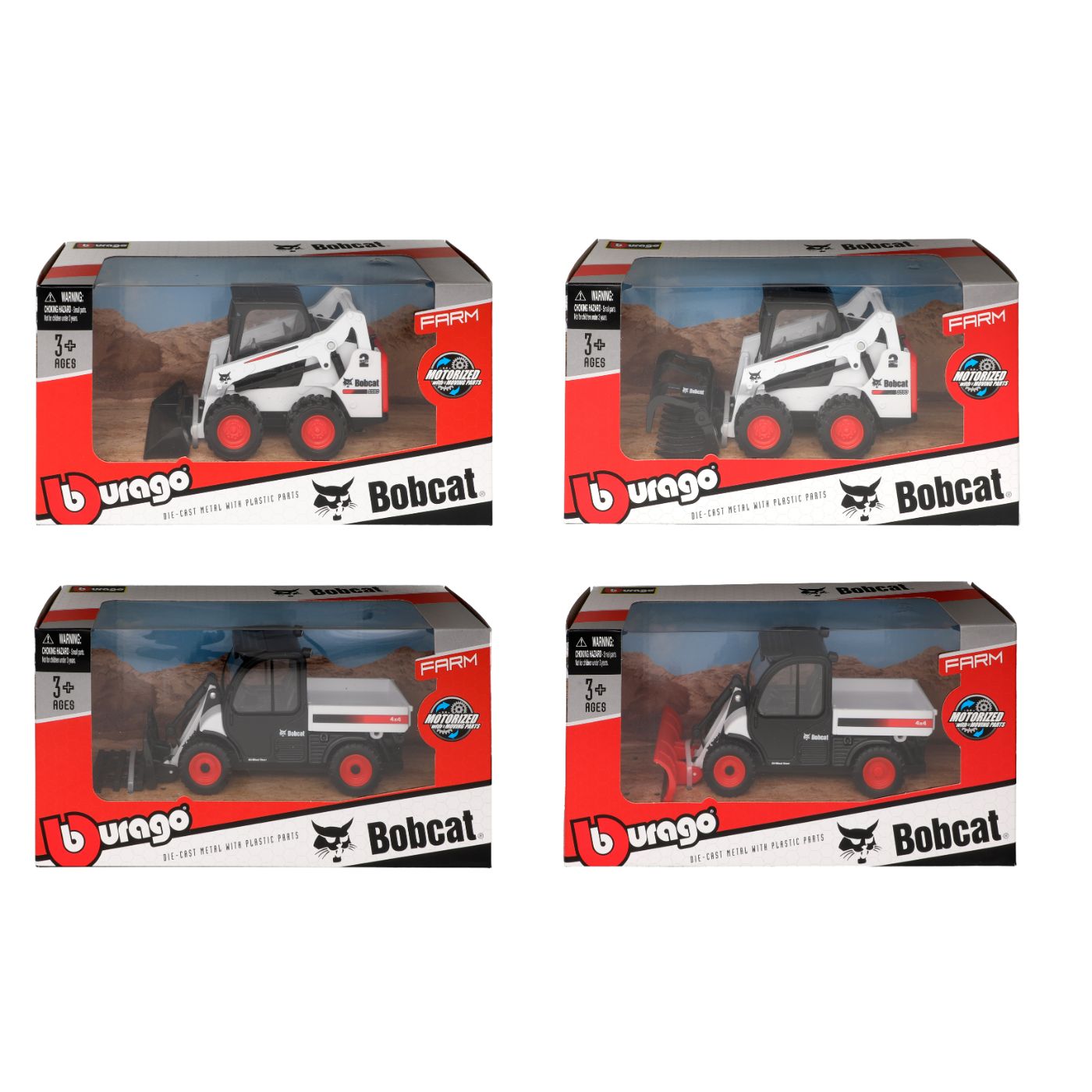 Bobcat-työkoneet lähtevät liikkeelle. Valko-mustat koneet ovat kiehtovia monipuolisuutensa, valtavan tehonsa ja vankan rakenteensa ansiosta. Burago tuo nyt rakennustyömaan suoraan olohuoneeseen Bobcatien avulla. Erittäin yksityiskohtaiset ja aidot työkoneet ovat noin 8 cm pitkiä ja sopii leluiksi yli 3 -vuotiaille lapsille.