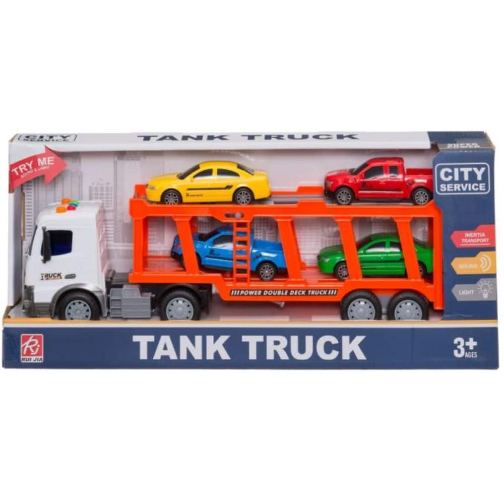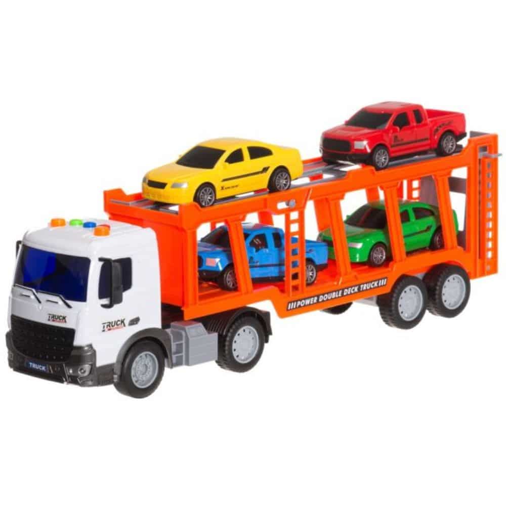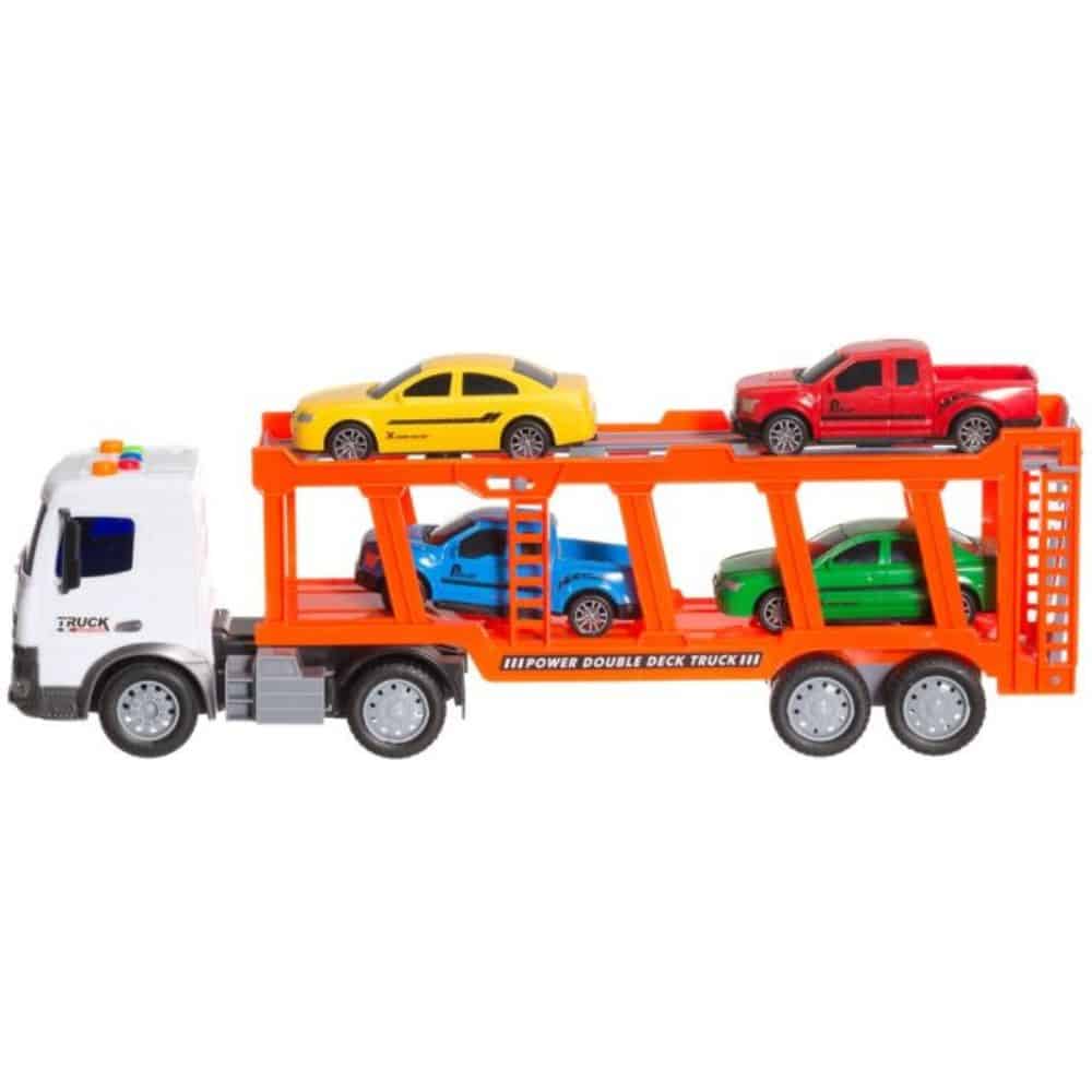 Autonkuljetusrekassa on autoja kahdessa kerroksessa. Mukana neljä erilaista pikkuautoa. Rekassa valo- ja äänitoiminnot.