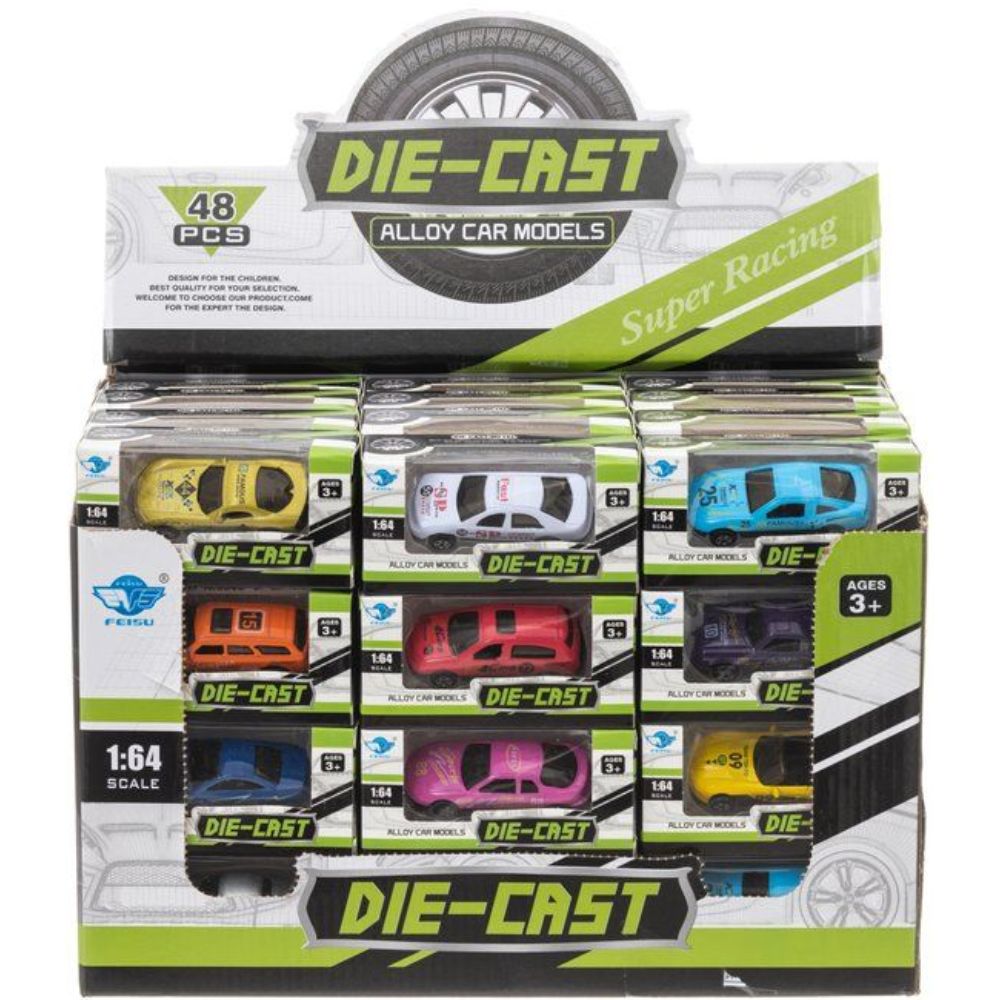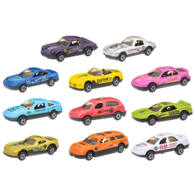 Värikkäitä pikkuautoja. Lajitelmassa on 12 erilaista autoa.
