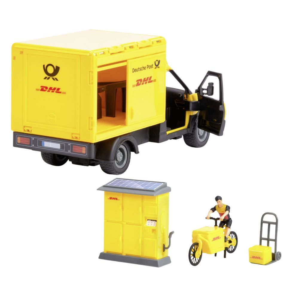 Sisältää DHL-pakettiauton valoilla ja äänillä, postimiehen, pyörän ja pakettiaseman.