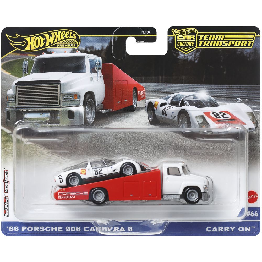 Hot Wheels Team Transport -sarjan Porsche Carrera ’66 on klassinen 1:64-mittakaavainen die-cast-pienoismalli, joka yhdistää legendaarisen Porsche Carreran ja tyylikkään kuljetusrekan. Tämä setti on täydellinen keräilijöille ja kilpa-autojen ystäville, sillä se esittelee yhden Porschen ikonisimmista malleista hienostuneella ja realistisella tavalla.