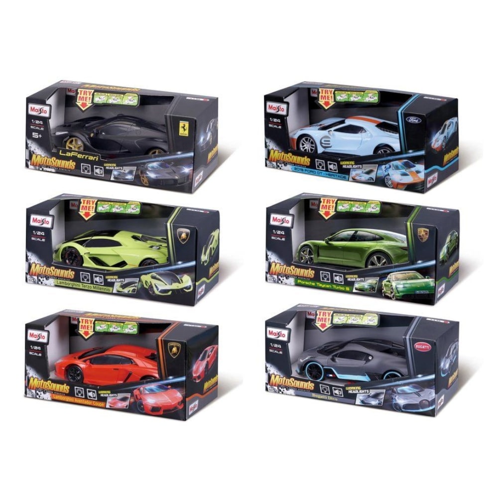 Erittäin yksityiskohtainen ja upea Motosounds-auto, jossa on ääni- ja valotoiminnot. Konepeltiä painamalla aktivoituvat etuvalot ja päheät moottoriäänet. Autossa on vapaasti pyörivät renkaat.