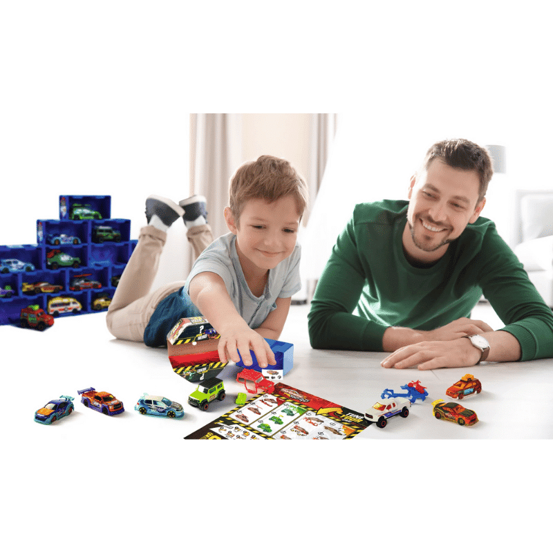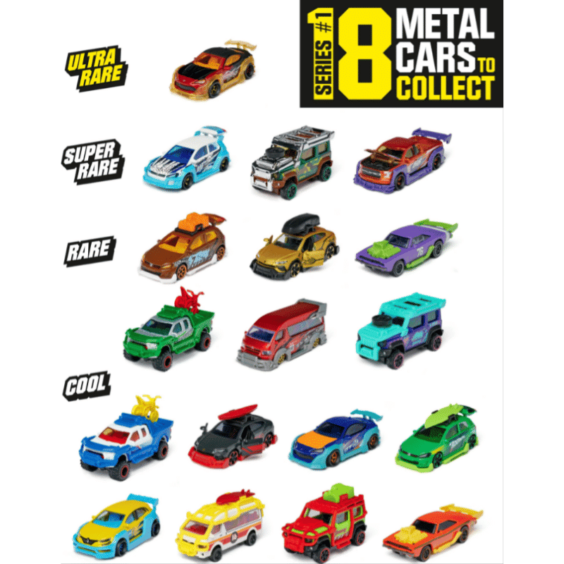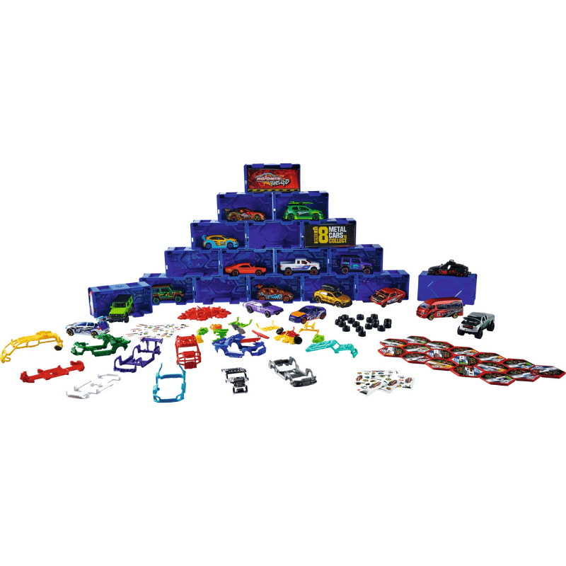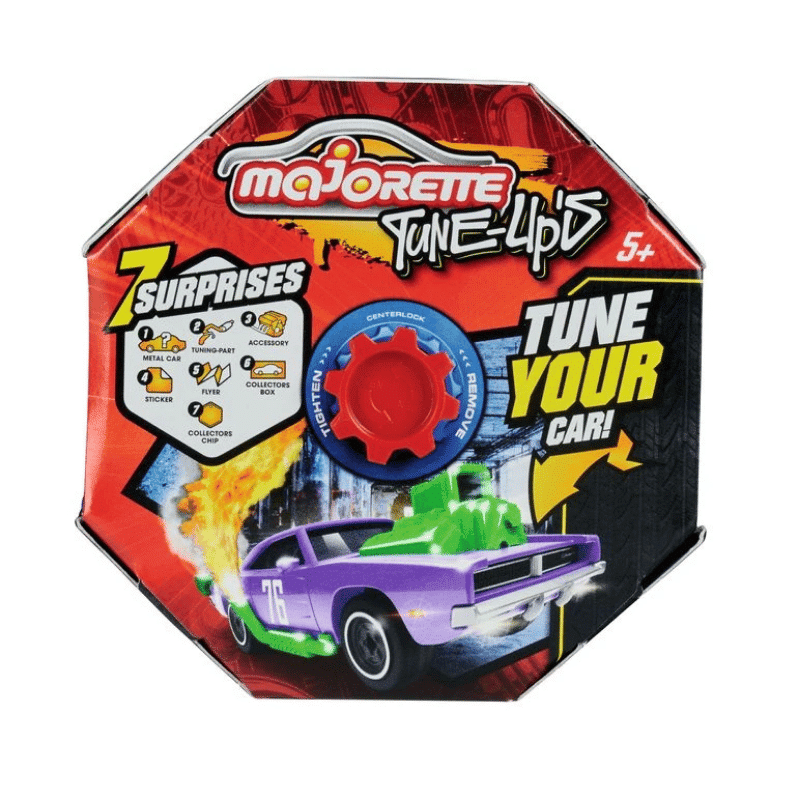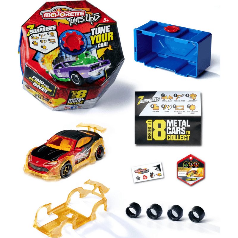 Tuunattava Majoretten yllätysauto, jonka mukana tulee kaksi tuunausosaa, keräilykortti, tarra-arkki, esite sarjan 18 keräilyautosta sekä kätevä säilytysrasia.