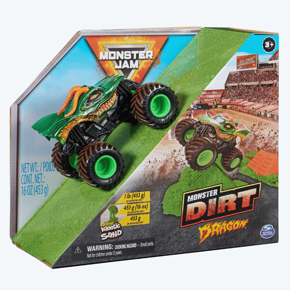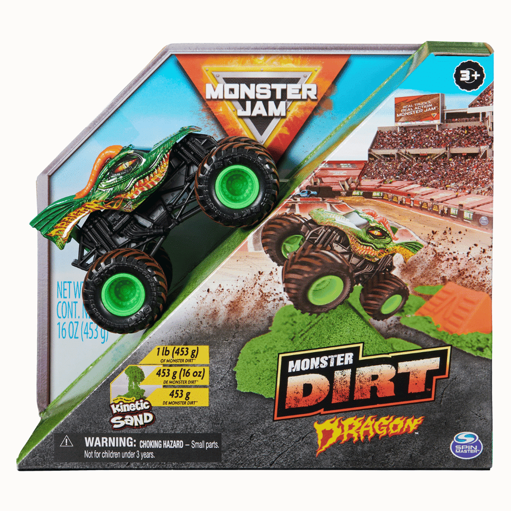 Monster Jam 1:64 Dirt Dragon. RAKENNA! HYPPÄÄ! TÖRMÄÄ! MURSKAA! TEE SE UUDESTAAN! Esittelyssä uusi Monster Jam Monster Dirt 453 g leikkisetti! Kinetic Sandin tekijät herättävät eloon Monster Dirtin, joka matkii aitoja Monster Jam olosuhteita! 453 g vihreää Monster Dirtiä nostaa hauskuuden seuraavalle tasolle ja tuo aivan uuden tavan leikkiä suosikki mini monsteriautoillasi.