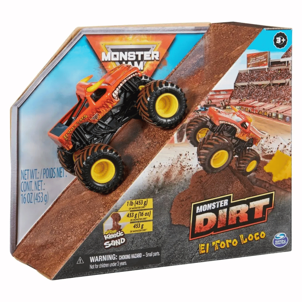 Monster Jam 1:64 Dirt El Toro Loco. RAKENNA! HYPPÄÄ! TÖRMÄÄ! MURSKAA! TEE SE UUDESTAAN! Esittelyssä uusi Monster Jam Monster Dirt 453 g leikkisetti! Kinetic Sandin tekijät herättävät eloon Monster Dirtin, joka matkii aitoja Monster Jam olosuhteita!