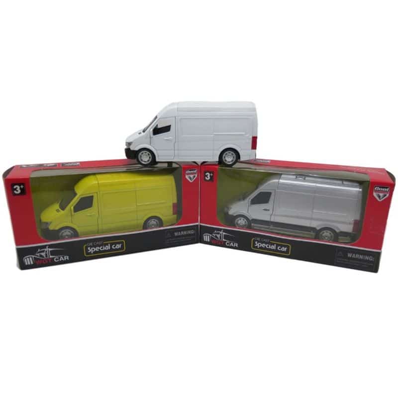 Kestävä metallinen pakettiauto avautuvilla etuovilla. Takaovet ovat muovia, ne voi avata ja sulkea, mutta vaatii näppäryyttä.