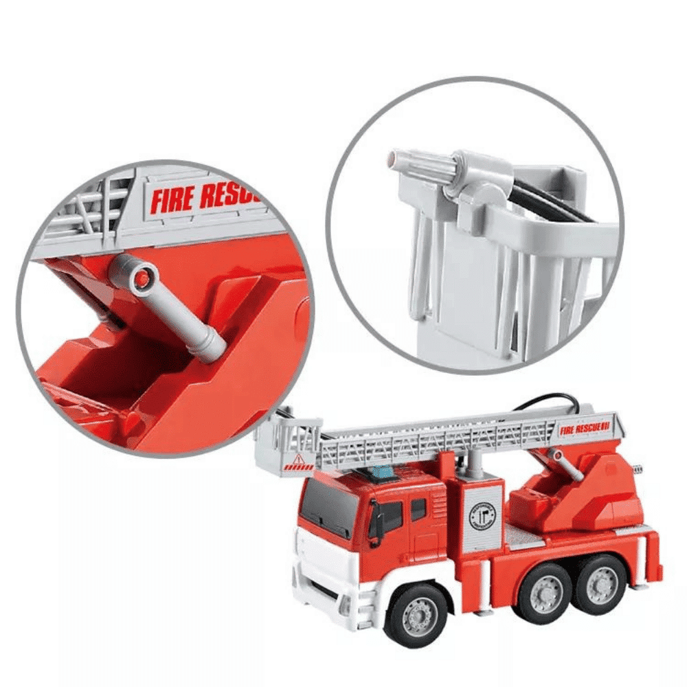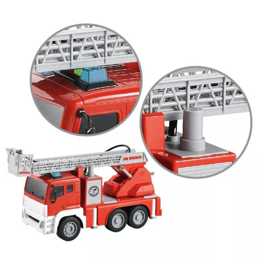 Autossa valot sekä erilaisia äänitoimintoja, kuten hälytyssireenin ääni. Tikkaat voi venyttää huikeaan 53 cm pituuteen. testiparistot 3 x AG13 (sisältyy). Täyttämällä vesisäiliön voit pumpata oikeaa vettä paloletkusta, mikä kulkee tikkaiden sisäpuolella. Autossa on myös alas laskettavat tukipilarit, jolla auto pysyy varmasti paikoillaan paloa sammutettaessa.