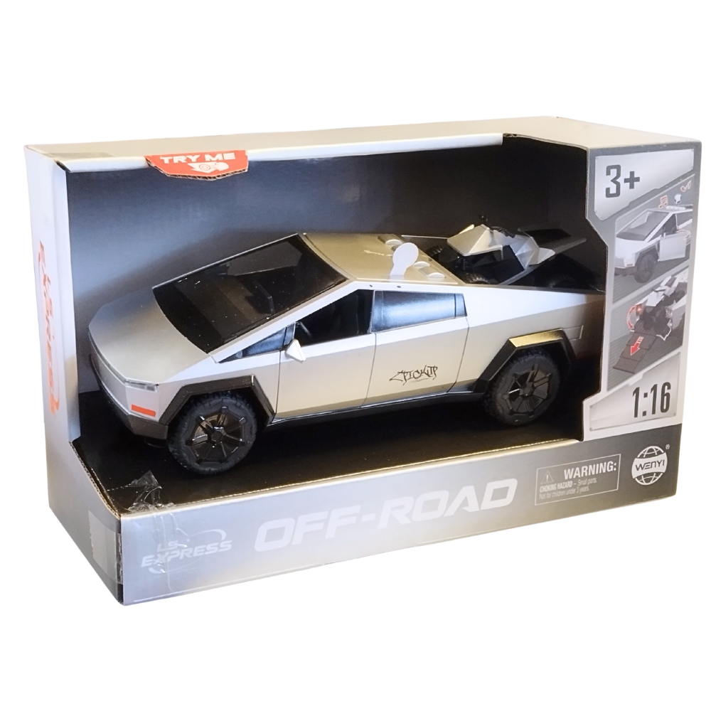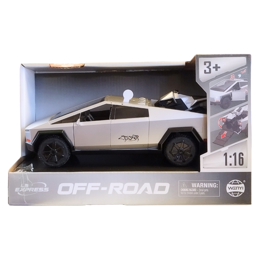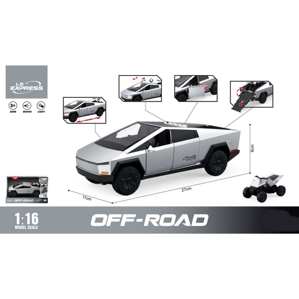 Tässä tulee tulevaisuuden sähköauto! Auton kyydissä on jopa pieni mönkijä. Takaosasta avautuu ramppi, jolloin mönkijän saa liikuteltua kyytiin ja pois kyydistä. Autossa on useita erilaisia äänitoimintoja sekä vauhtipyörät.