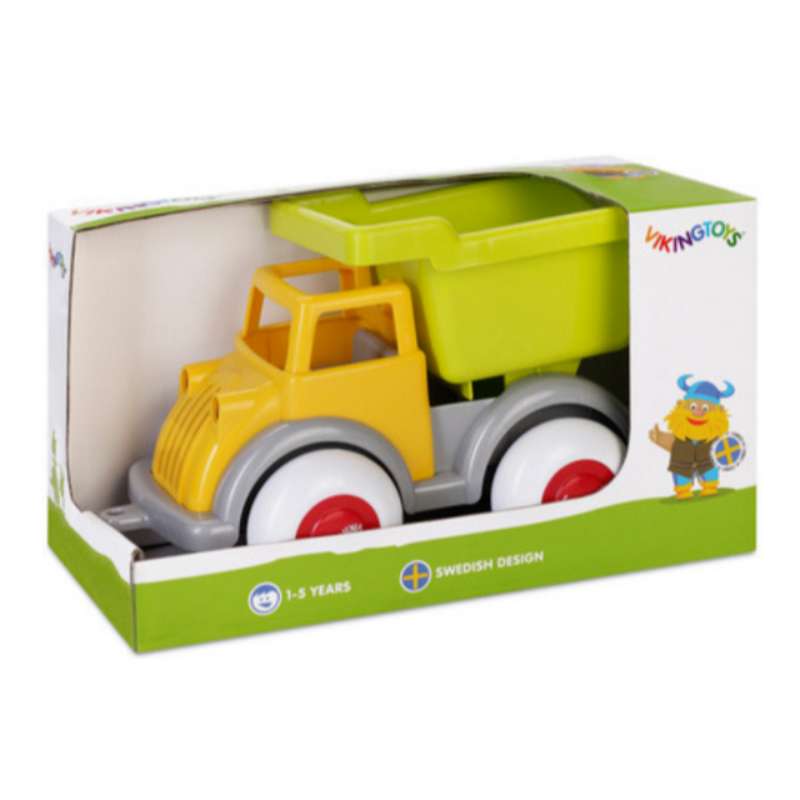 Hienon värinen kuorma-auto, jossa on pehmeät renkaat. Turvallinen lelu pienille lapsille.