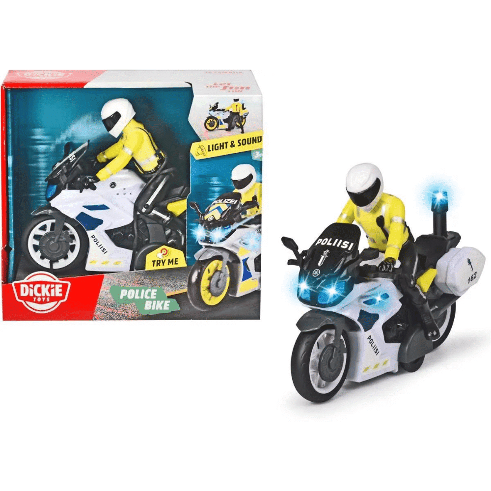 Suomalainen poliisimoottoripyörä kitkamoottorilla, valoilla, äänellä ja liikkuvalla kuljettajahahmolla. Lelun mukana tulee irrotettava poliisihahmo, jossa on liikkuvat kädet ja jalat. Aito sininen valo ja sireeni, jotka voidaan kytkeä päälle painamalla ajoneuvon painiketta. (Sisältää 3x AAA testi-paristoa.)