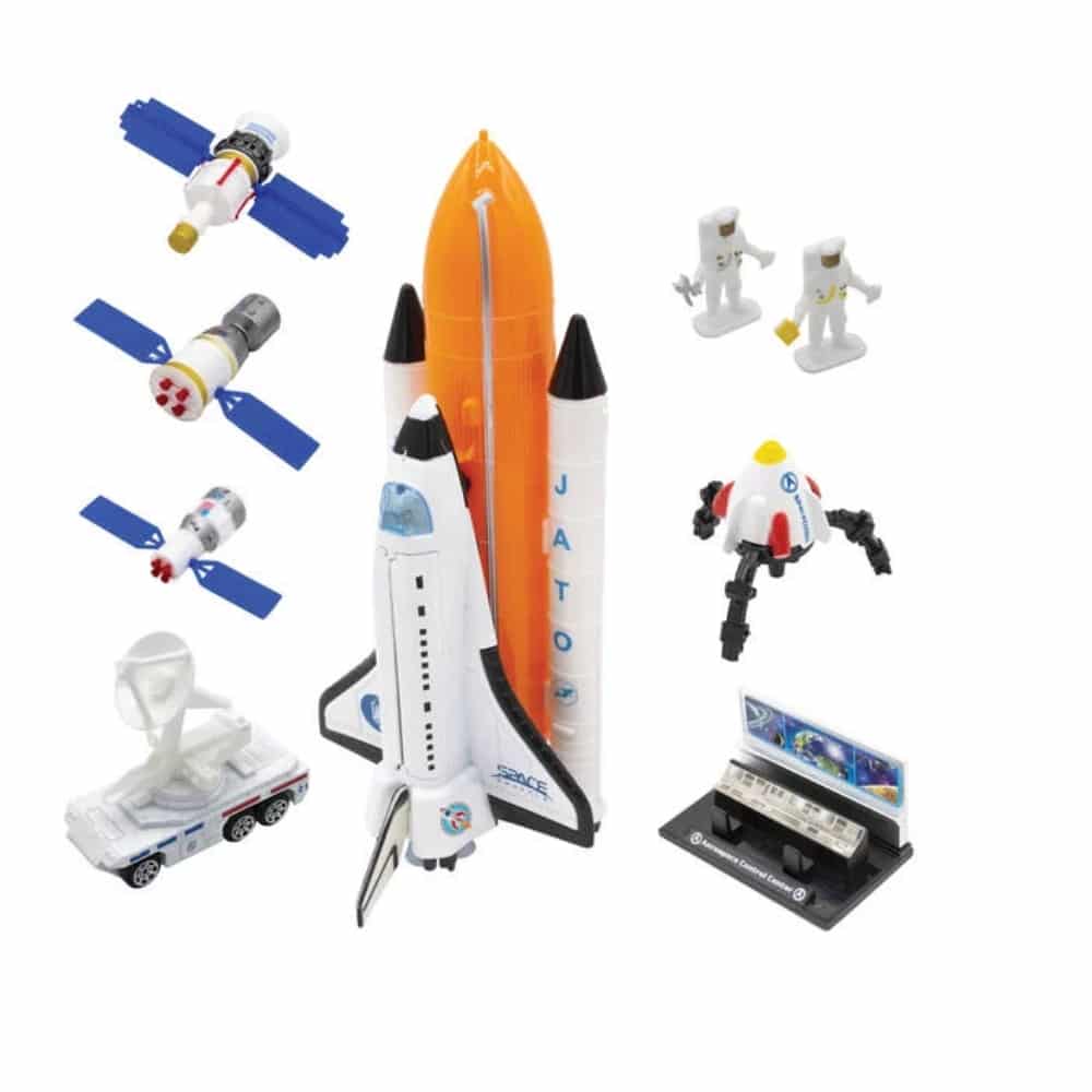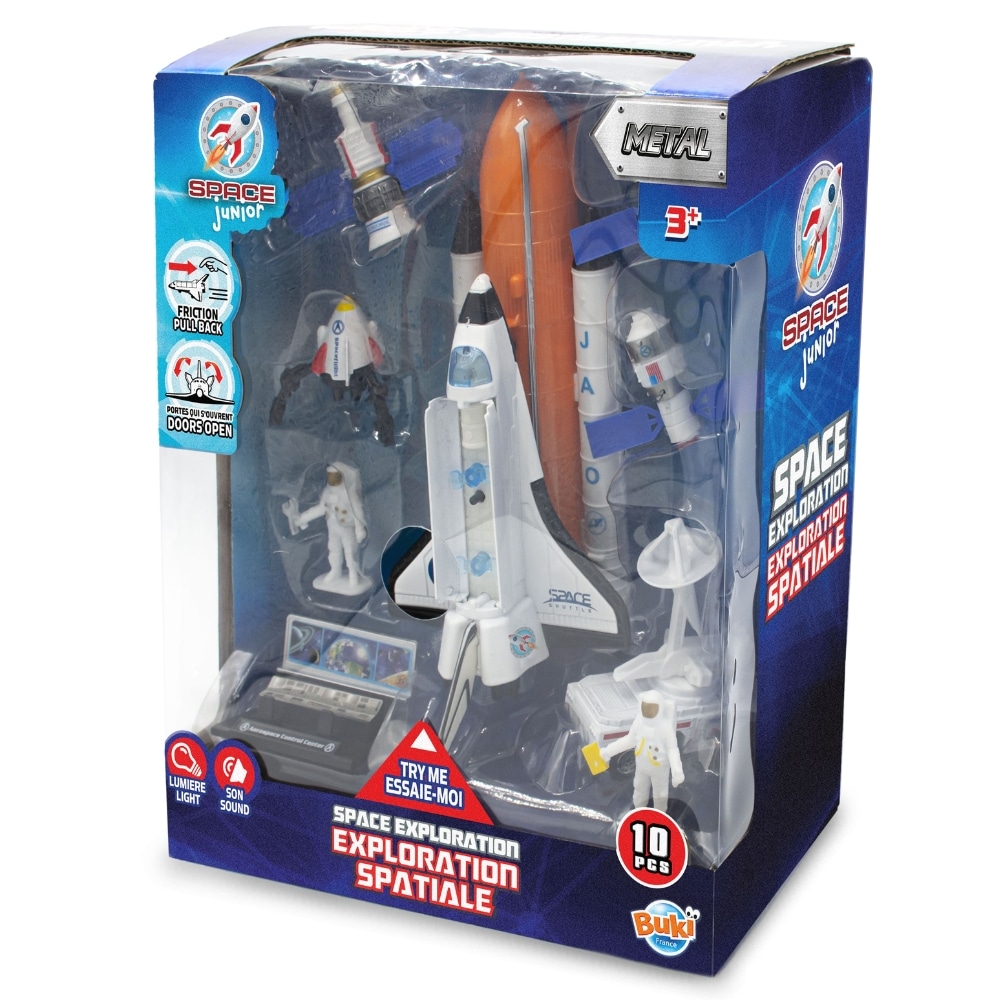Avaruustutkimussetti Space Junior metal, jossa on avaruussukkula ja metallinen satelliittitrukki. Aseta sukkula tehostimen päälle, paina painiketta käynnistääksesi ääni- ja valotoiminnot, ja katso kuinka alus nousee.
