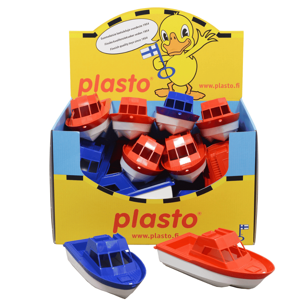 Muovinen kevyt Plasto vene 20 cm, jolla voi leikkiä uima-altaassa, lätäkössä ja hiekkalaatikolla. Monikäyttöinen pieni vene kelluu hyvin.