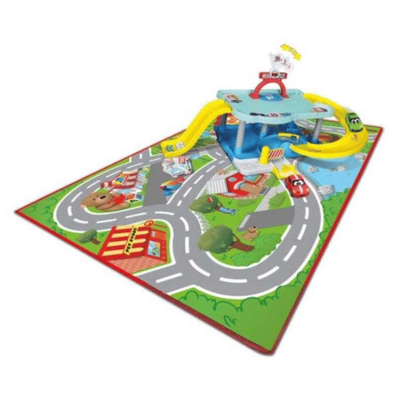 Pysäköintihallin koko on 67 x 38 x 32 cm ja leikkimatton 100 x 70 cm.