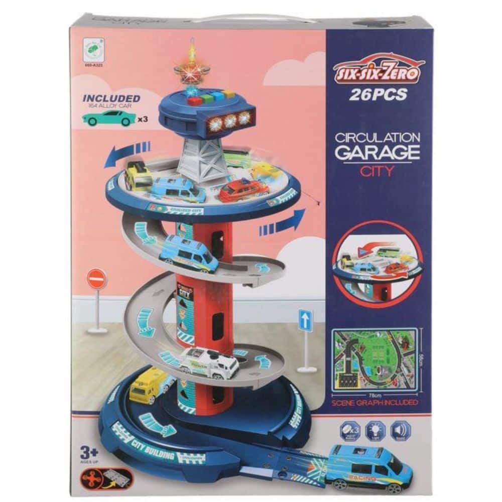 Parkkitalo valo- ja äänitoiminnoilla. Koko 33 x 28 x 60 cm. Mukana 3 kpl 1:64 autoa, leikkimatto ja liikennemerkkejä. Pyöräytä ylhäällä olevaa kerrosta ja lähetä autot alas pitkin ramppia.