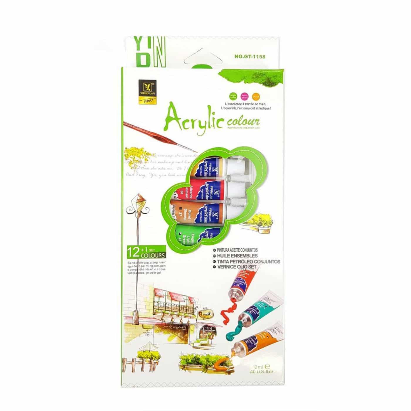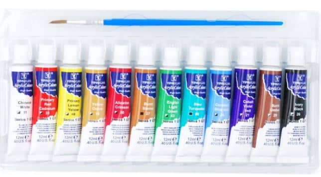 Akryylivärit tuubissa á 12 ml ja sivellin.