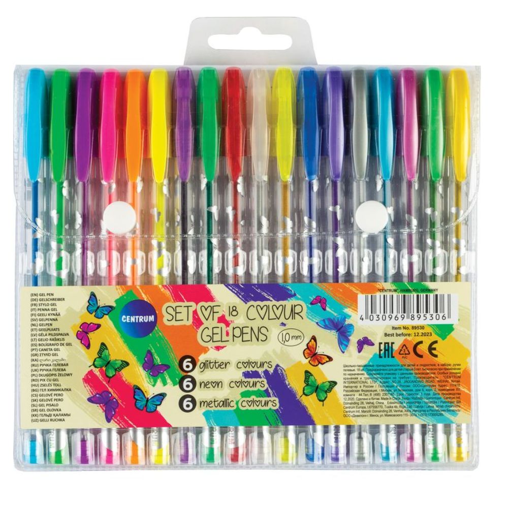 Centrumin 18 värin geelikynäsarja tarjoaa erinomaisen valikoiman kirkkaita ja eloisia sävyjä, jotka sopivat monenlaisiin kirjoitus- ja koristelutarpeisiin. Tämä setti on täydellinen valinta niin koululaisille, opiskelijoille kuin aikuisillekin, jotka rakastavat väreillä leikkimistä ja taiteellista ilmaisua.