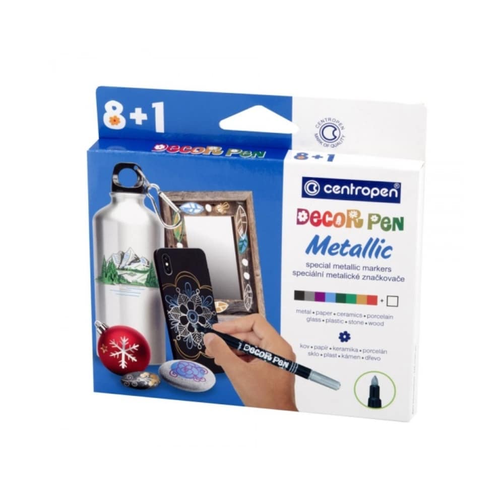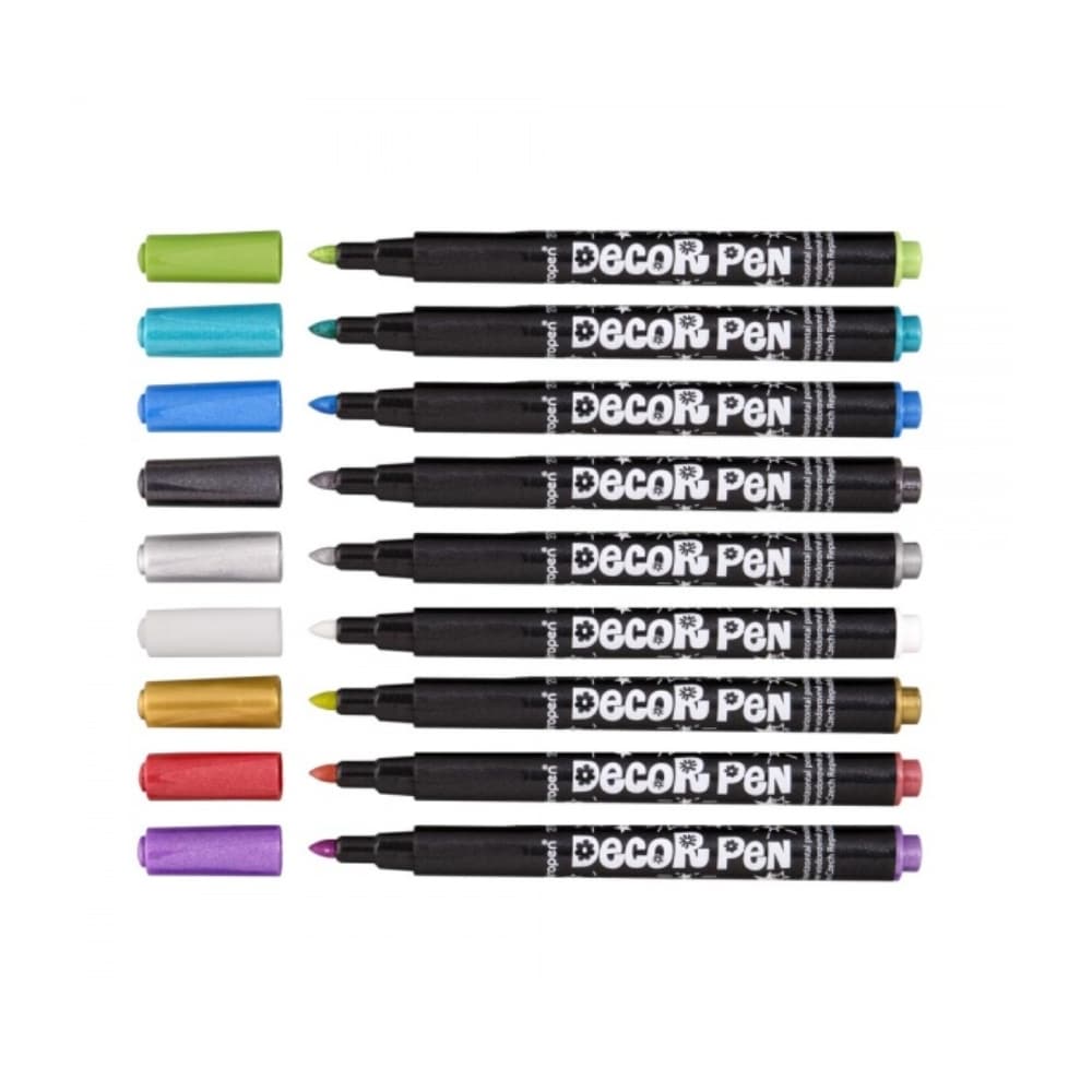 Tutun joka paikan koristelukynän Decor Penin rinnalle on tullut kimaltava ja metallinhohtoinen DECOR PEN METALLIC. Pakkauksessa 8 väriä ja valkoinen kynä. Pyöreäkärkinen huopakynä kirjoittaa useimmille pinnoille ja muste on vesipohjainen. Muste tulee kulutuksen ja veden kestäväksi neljän tunnin päästä kirjoittamisesta ja kestää UV-säteilyä. Kynässä on ergonominen ote ja ilmastoitu turvakorkki.