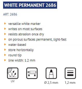 Huopakynä, valkoinen tussi, pyöreä kärki, kirjoitusjälki 1,2 mm.