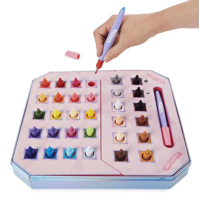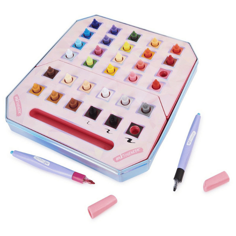Inkfluencer Click N Color Setillä voit piirtää upeita taideteoksia. Pakkaus on luotu yhteistyössä TikTok vaikuttajien kanssa. Pakkauksessa tulee kaikki mitä tarvitset hauskaan värittämiseen. Pakkauksessa on kaksi tussia, 32 eri väristä tussinpäätä ja upea säilytyslaukku. Mustia tussinpäitä löytyy kolmea eri leveyttä. Piirtäminen on helppoa, valitse haluamasi väri. paina tussia väriin kunnes kuulet pään kliksahtavan paikalleen, ja olet valmis taiteilemaan! Sopii hyvin värityskuvien värittämiseen ja moneen muuhun piirtämiseen. Kun haluat vaihtaa väriä, paina nappia kynän päässä ja pudota tussinpää takaisin paikoilleen. Tämän jälkeen tussissa ei ole päätä ja voit valita siihen uuden värin. Helppoa ja hauskaa!